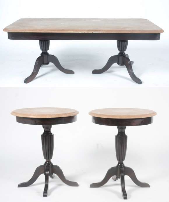 Conjunto de 3 mesas, sendo: uma de centro e par de mesinhas laterais com tampo de mármore.