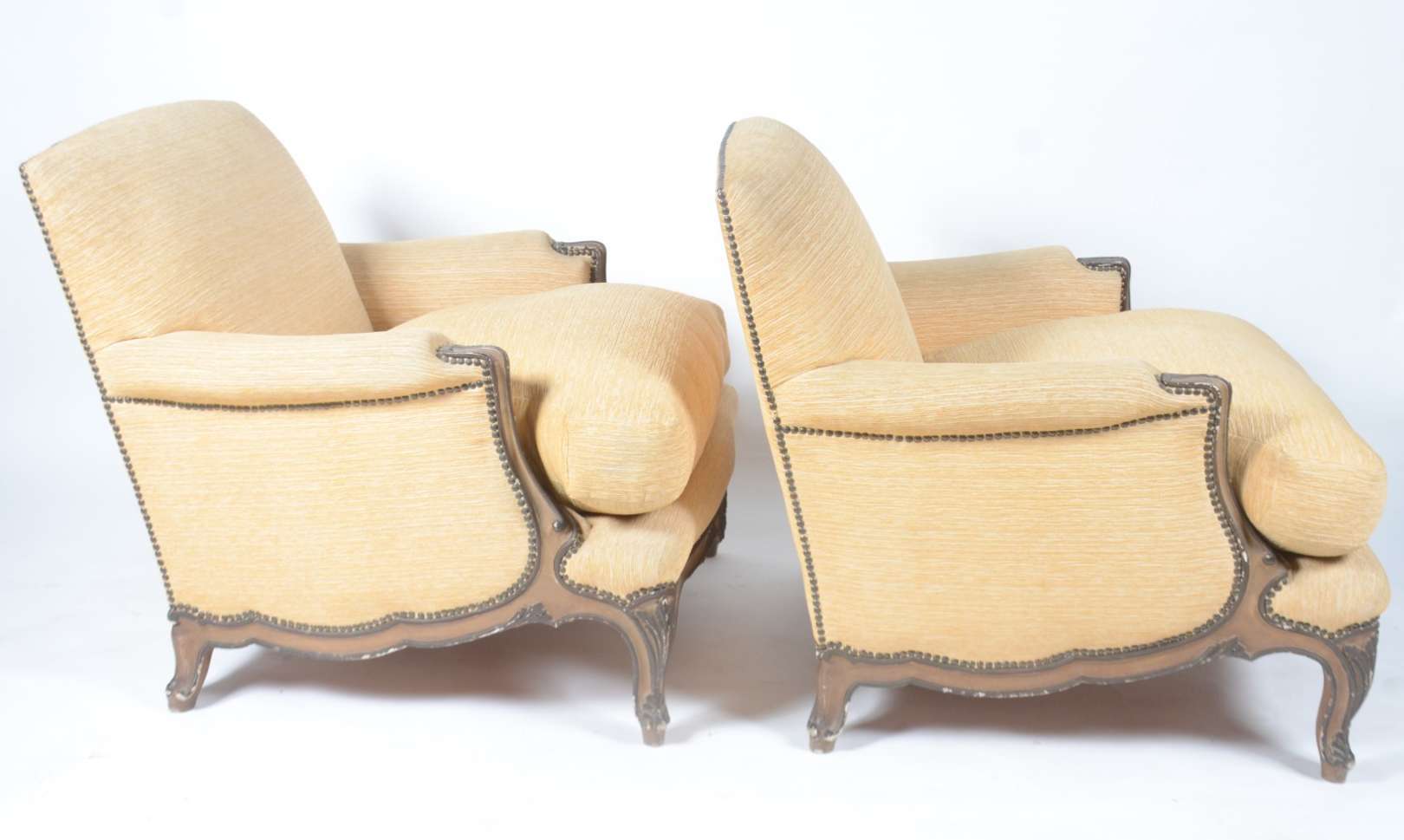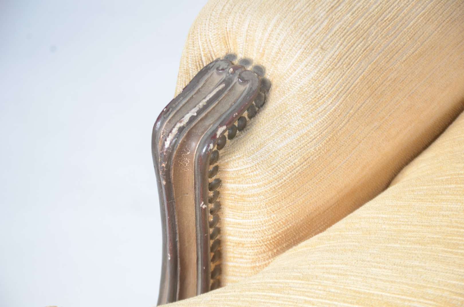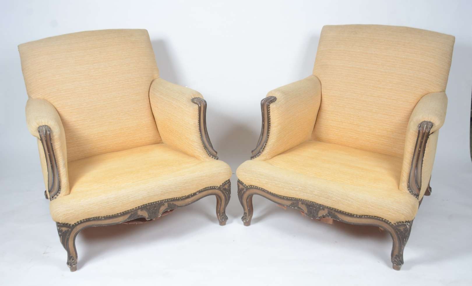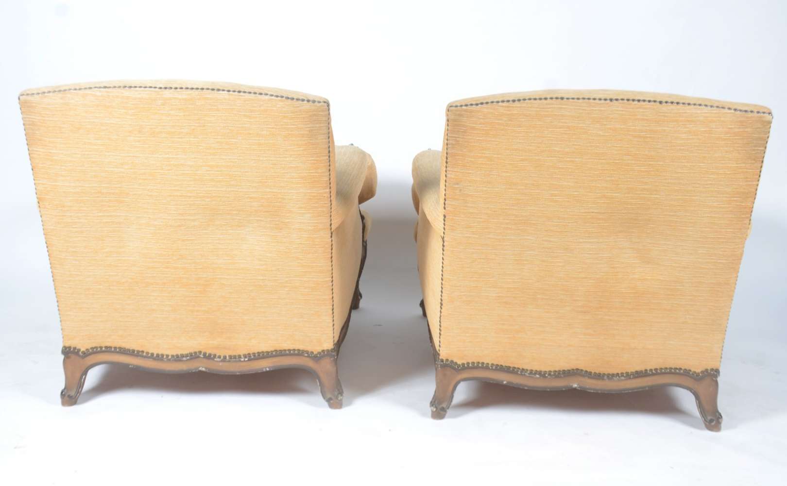 Par de poltronas de madeira nobre, estilo Luis XV, estofamento forrado com tecido na cor bege e tacheados. Desgastes.