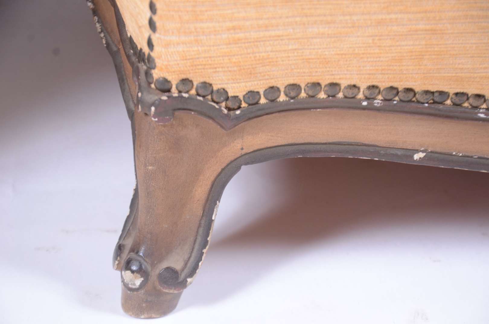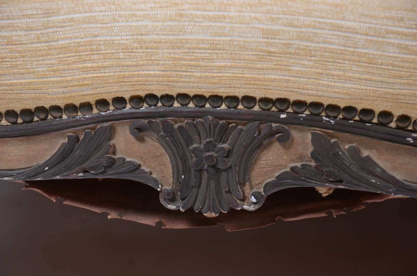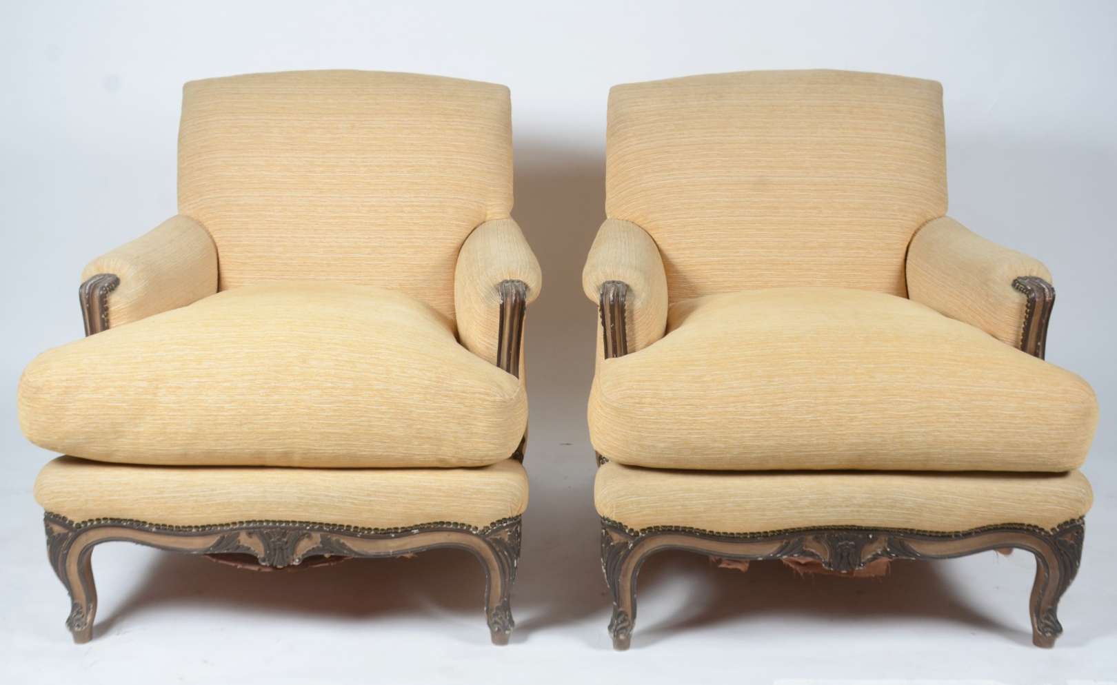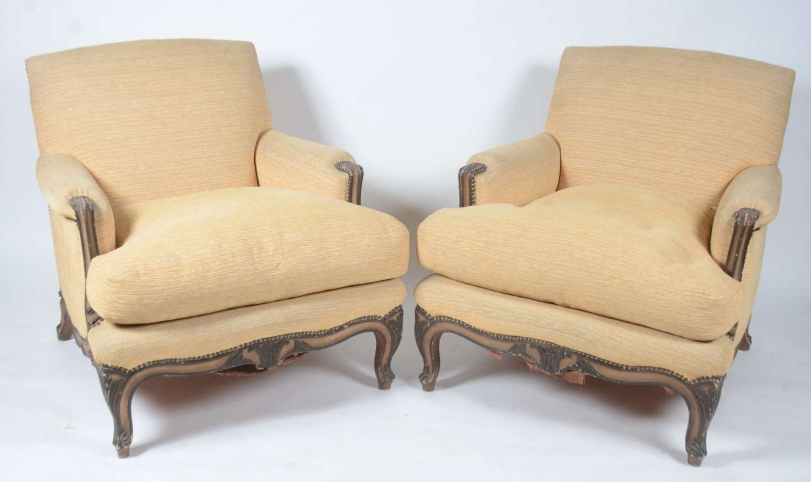 Par de poltronas de madeira nobre, estilo Luis XV, estofamento forrado com tecido na cor bege e tacheados. Desgastes.