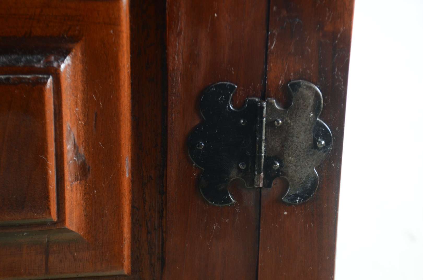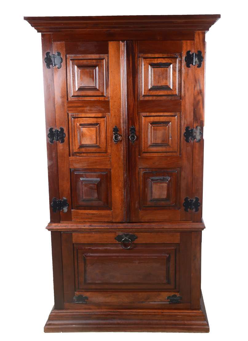 Baú em madeira clara, ferragens aparentes.