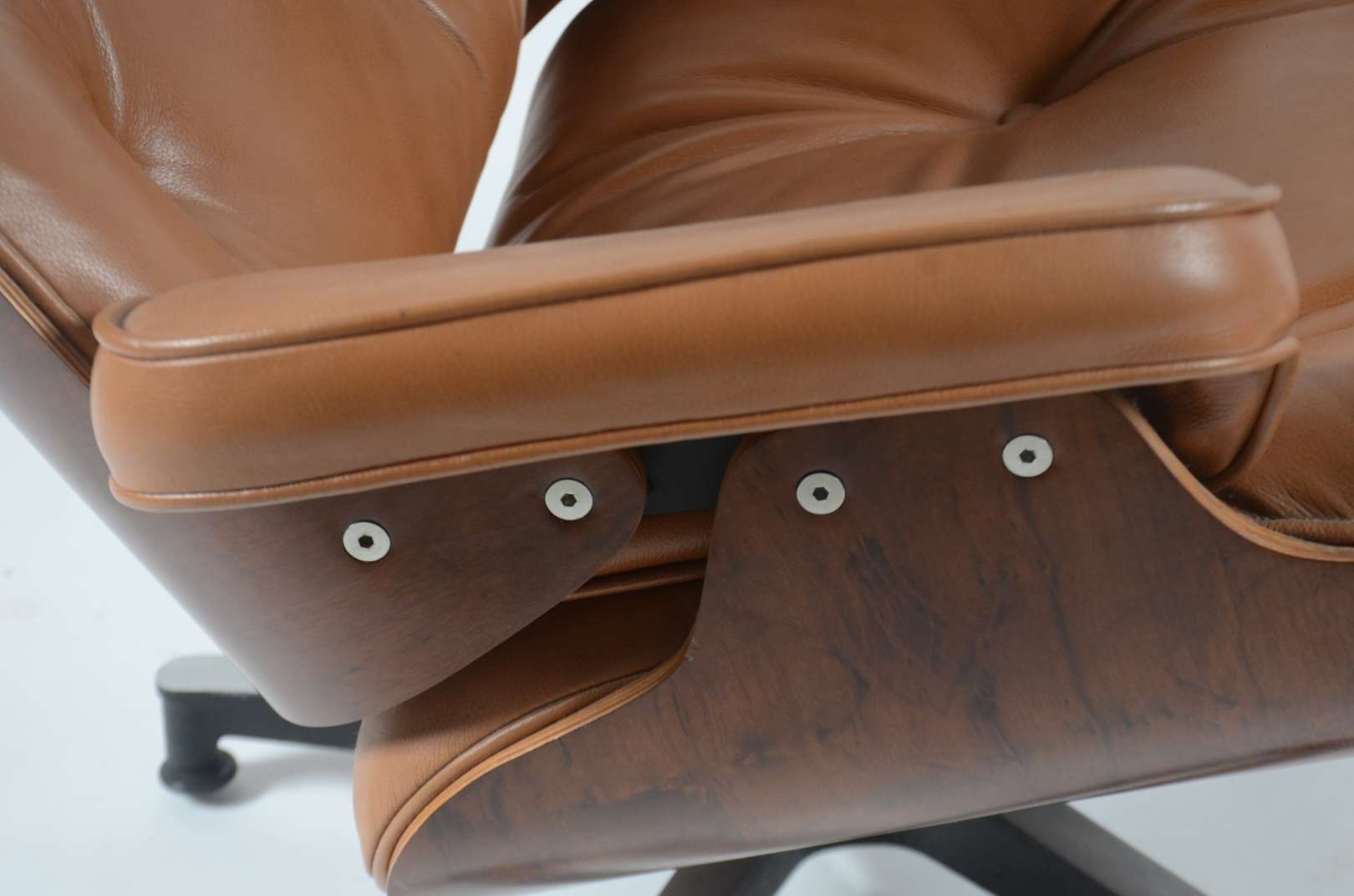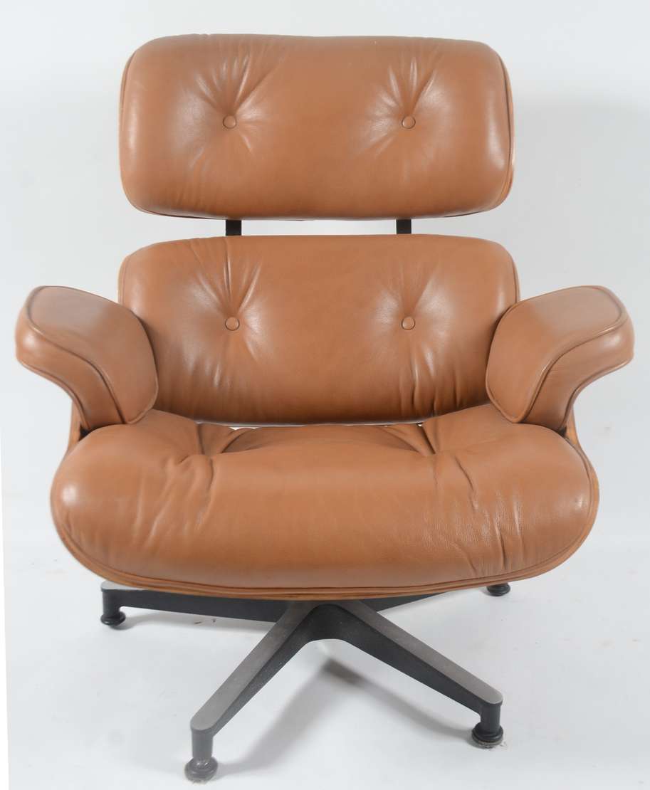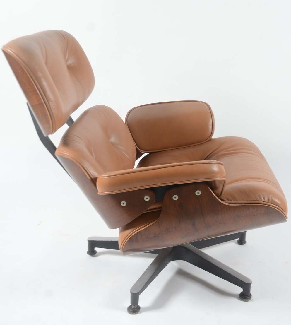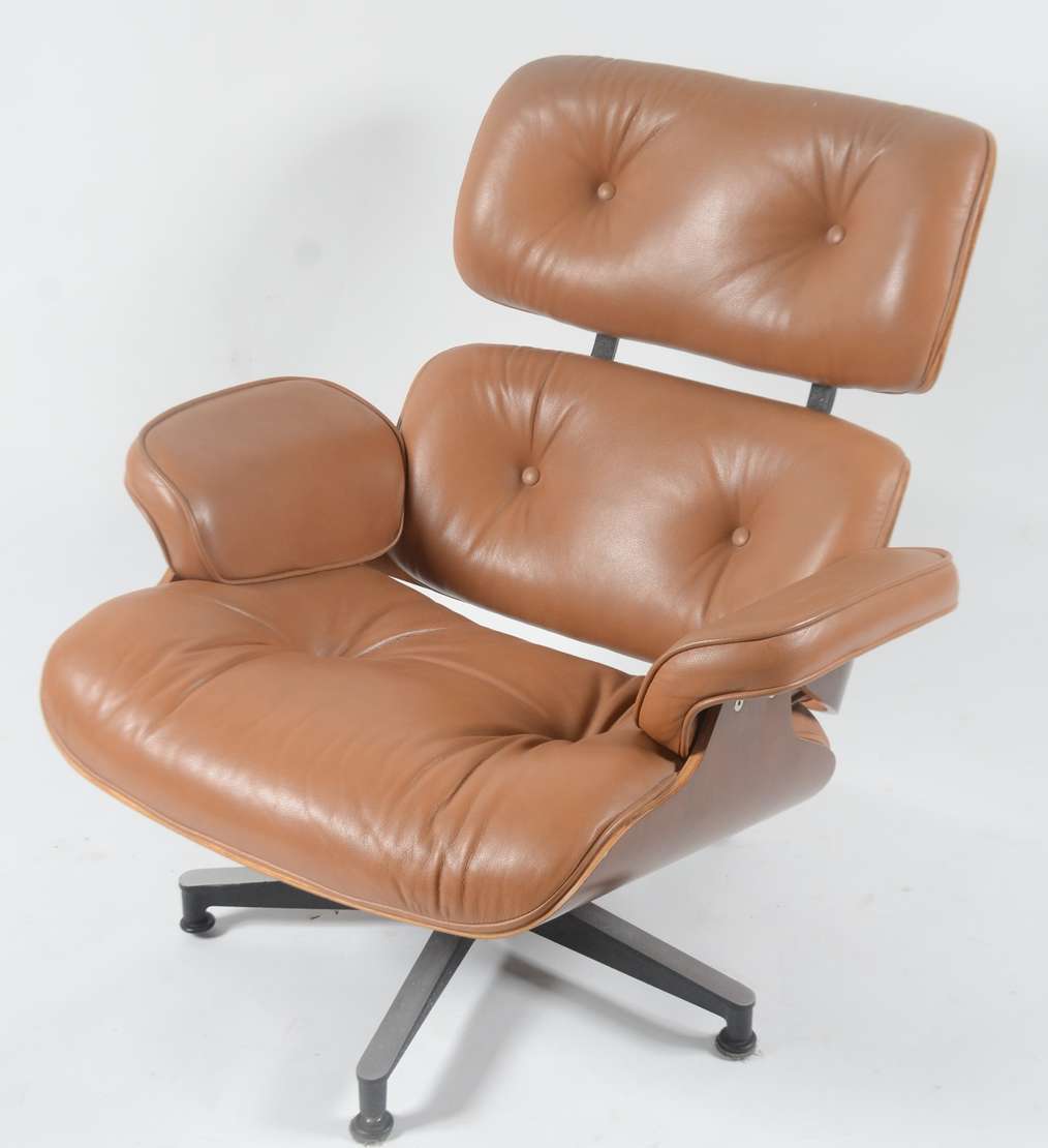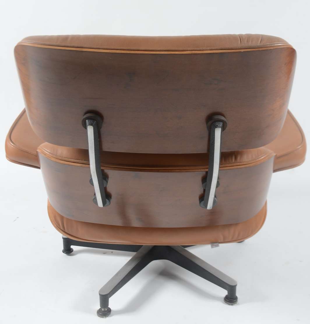 Poltrona "Charles Eames" da Clássica Design, em madeira e couro ecológico na cor caramelo, pés de metal.