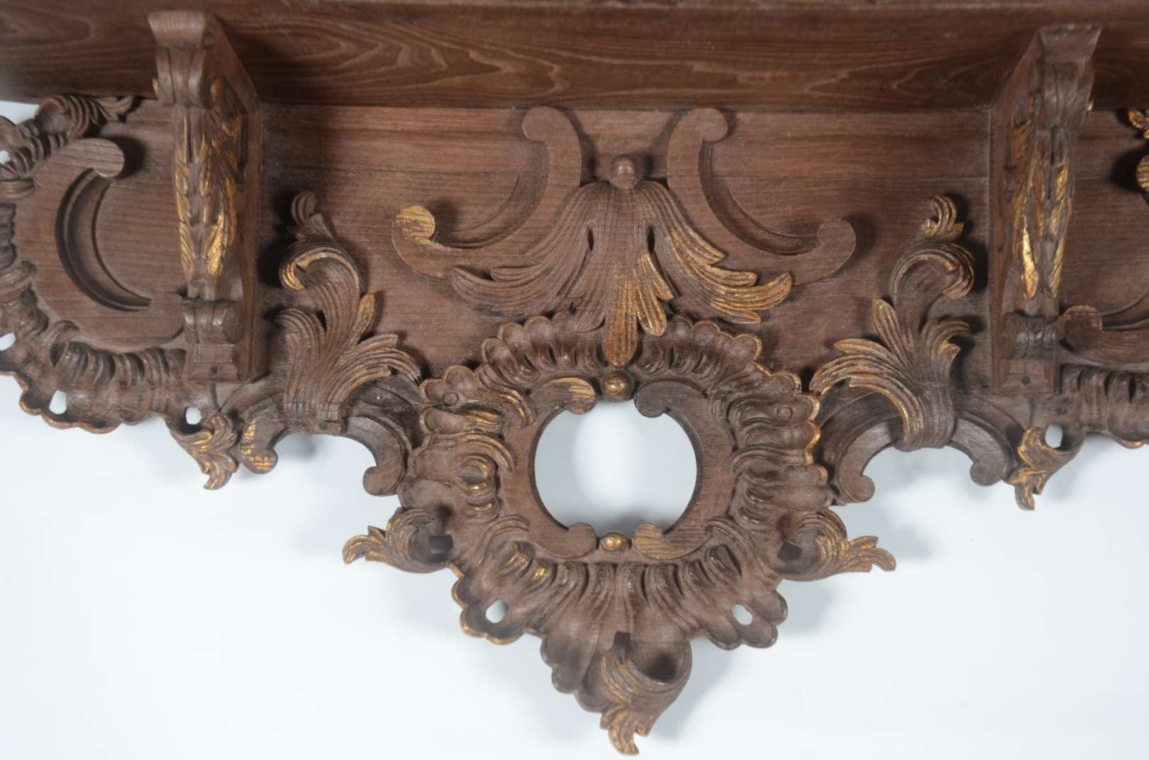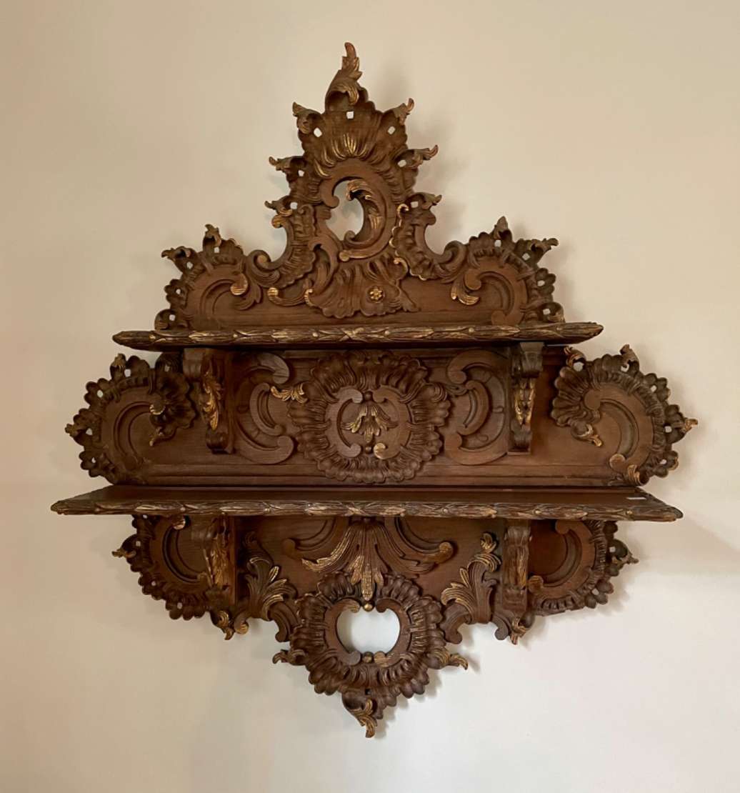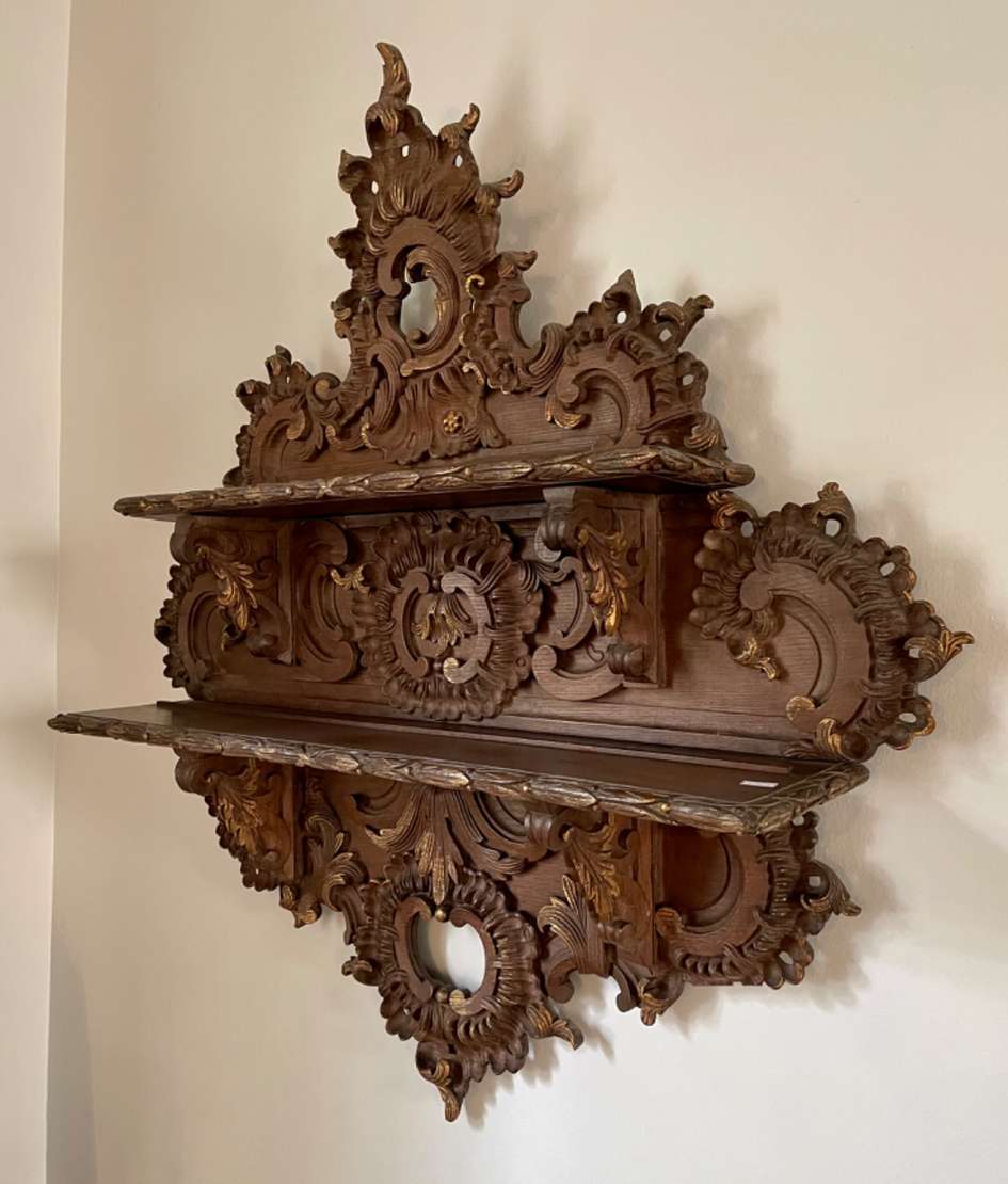Porta bibelot de parede em madeira ricamente entalhada, duas prateleiras e detalhes vazados.