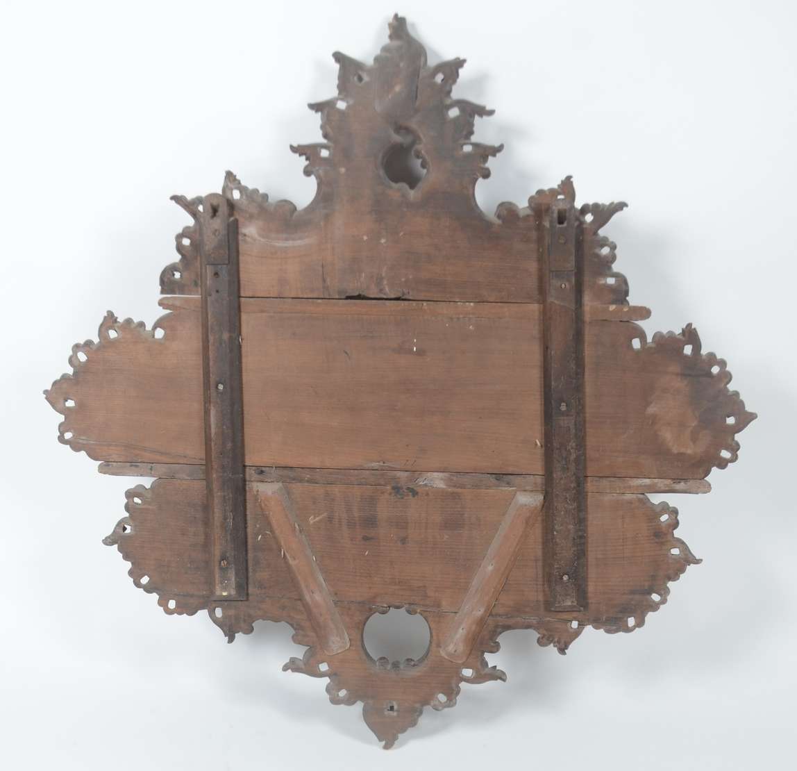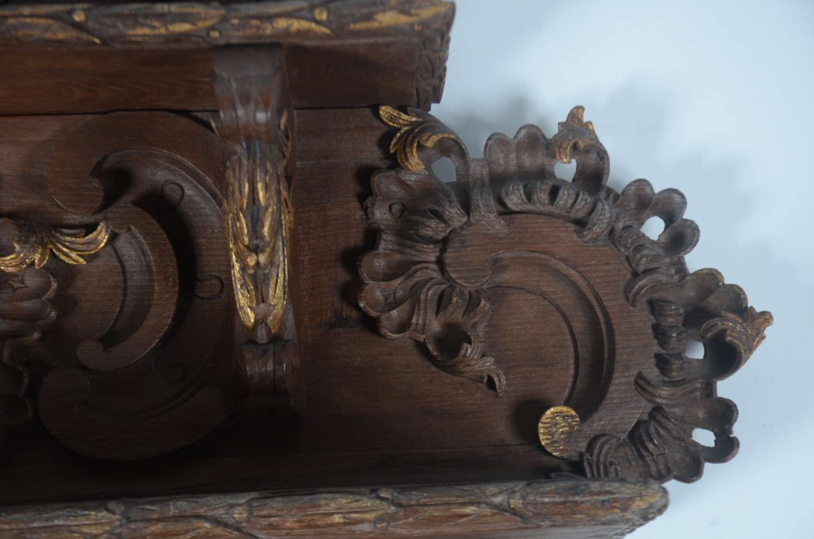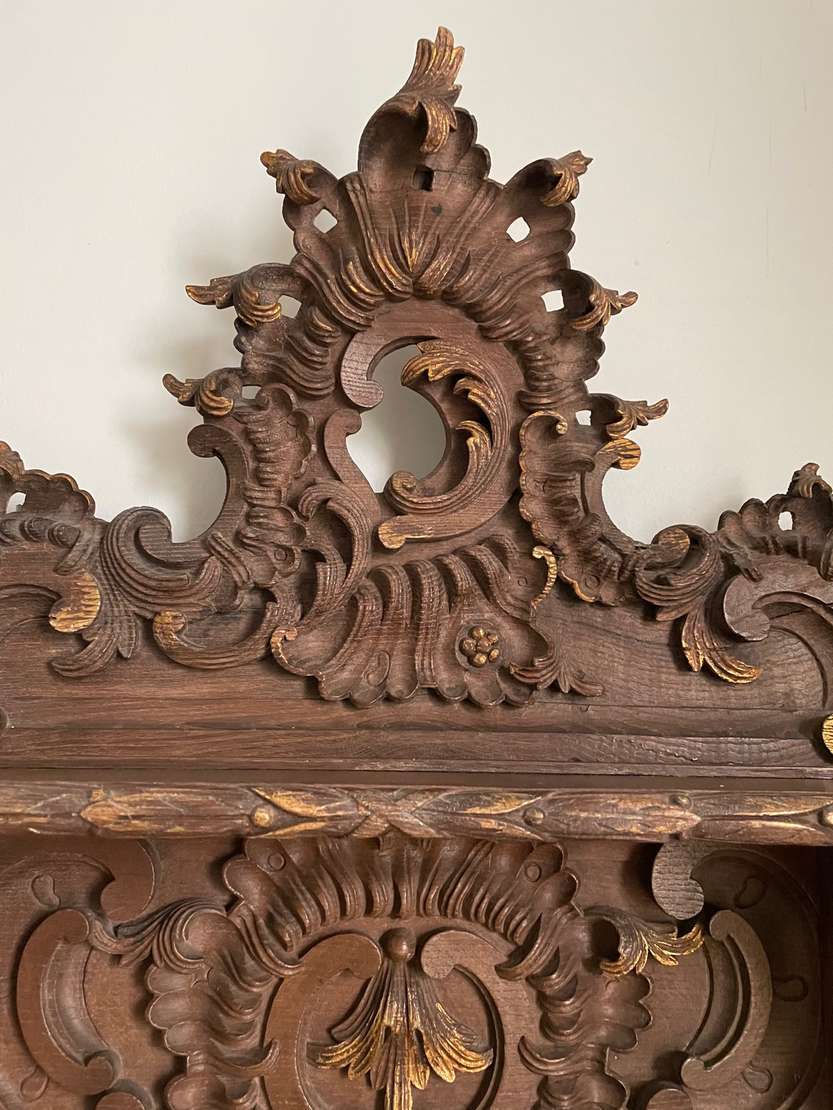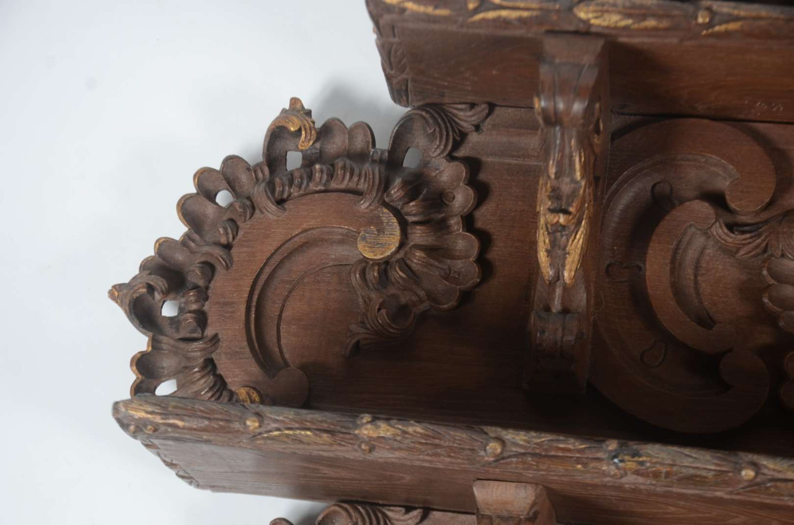 Porta bibelot de parede em madeira ricamente entalhada, duas prateleiras e detalhes vazados.