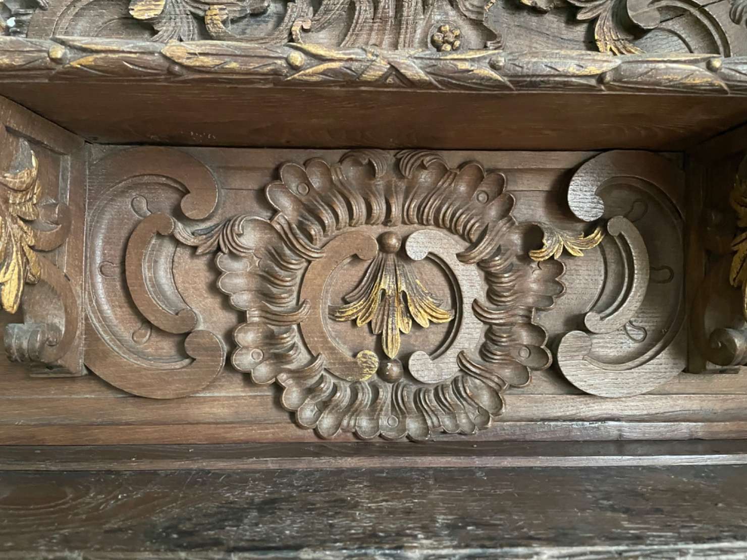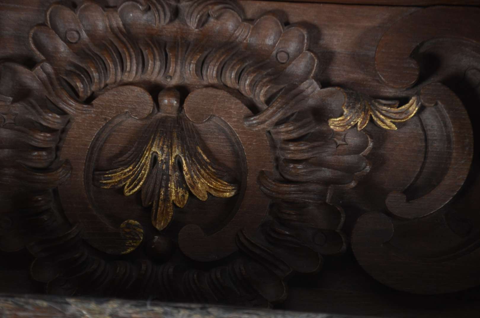 Armário de madeira nobre, estilo colonial brasileiro. Parte inferior com tampo frontal articulado, alçada com duas po...