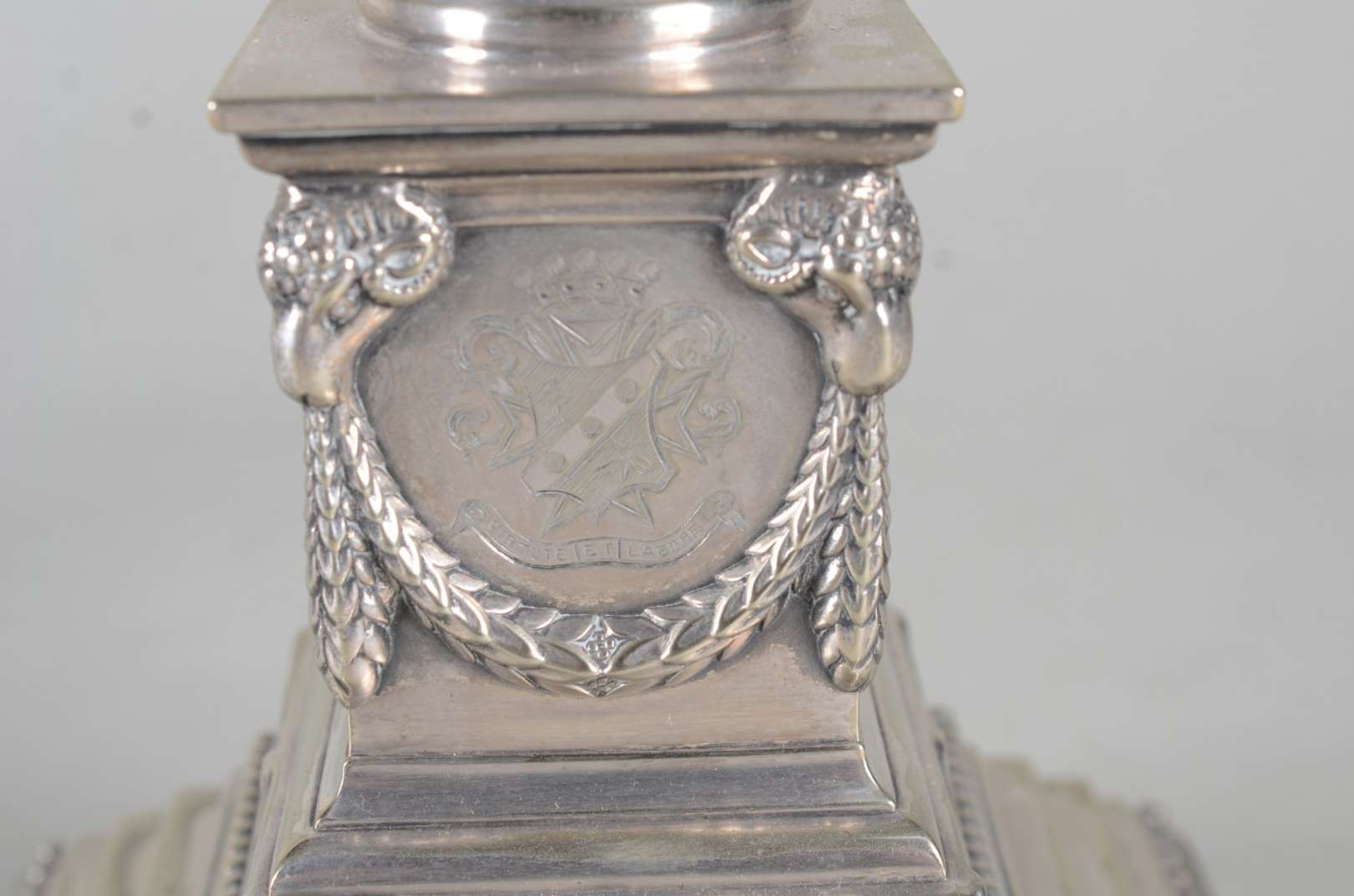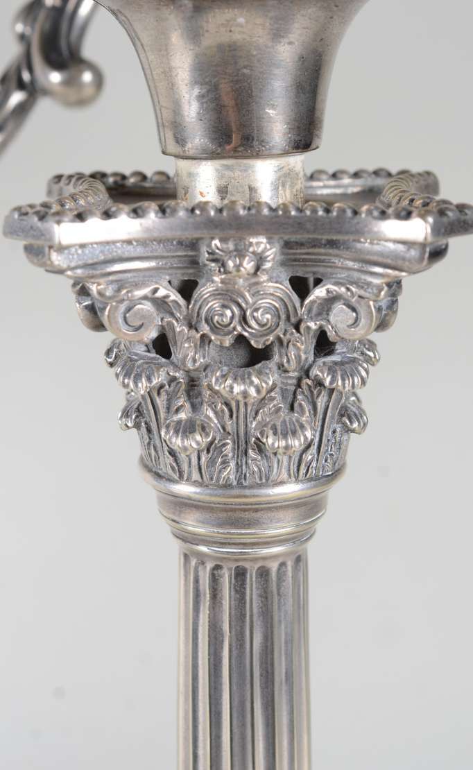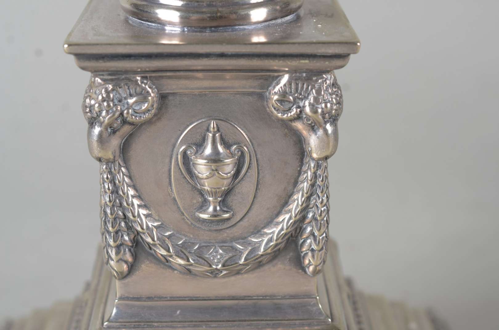 Luminária na forma de tocheiro em estanho, manga de vidro fosco.