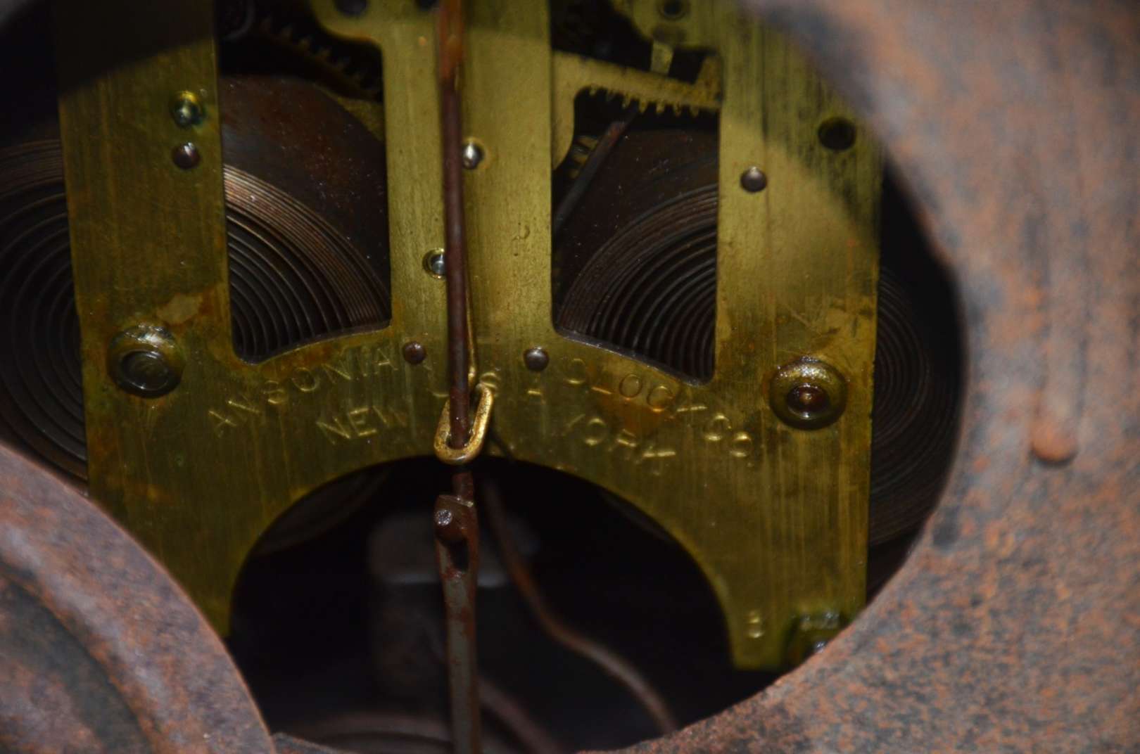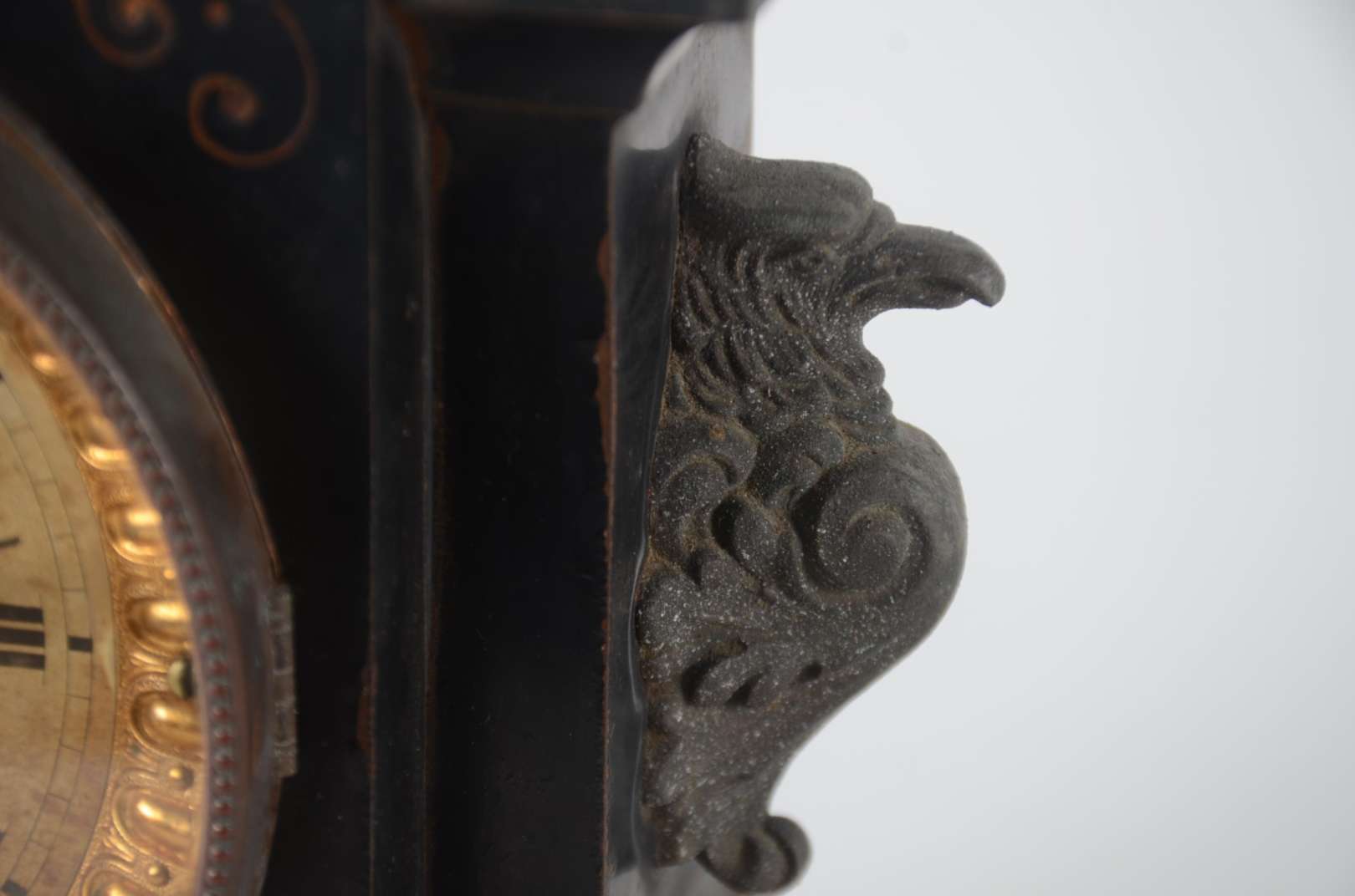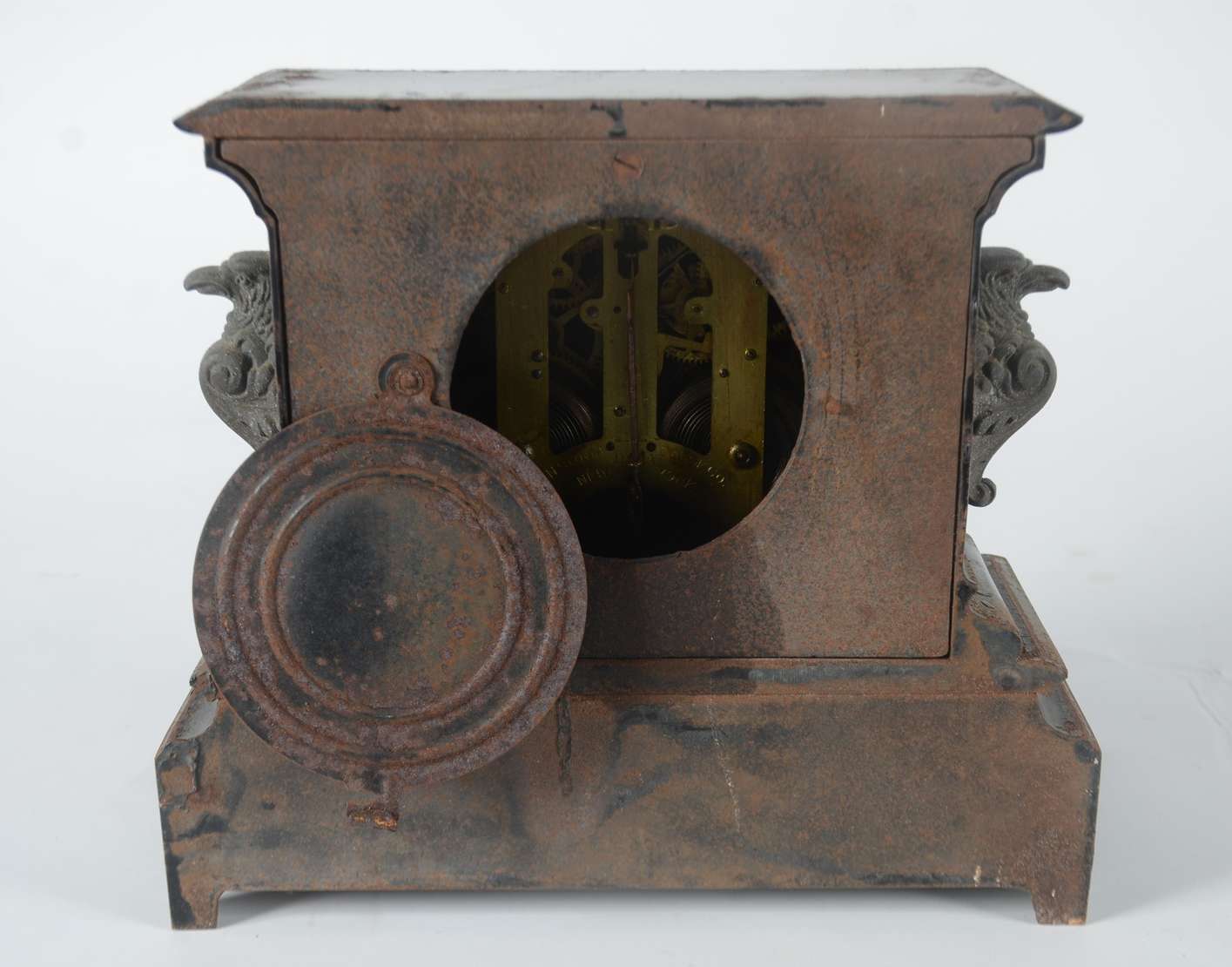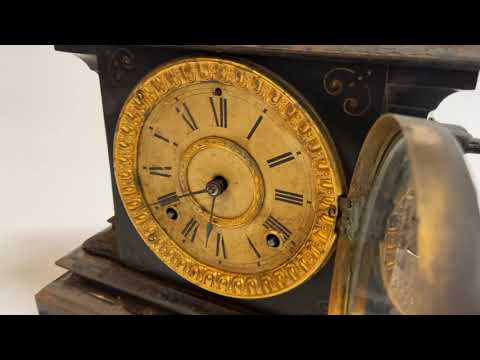 Relógio de coluna com caixa de madeira e mostrador, pêndulo e pesos de metal dourado. Funcionando, mas precisando de ...