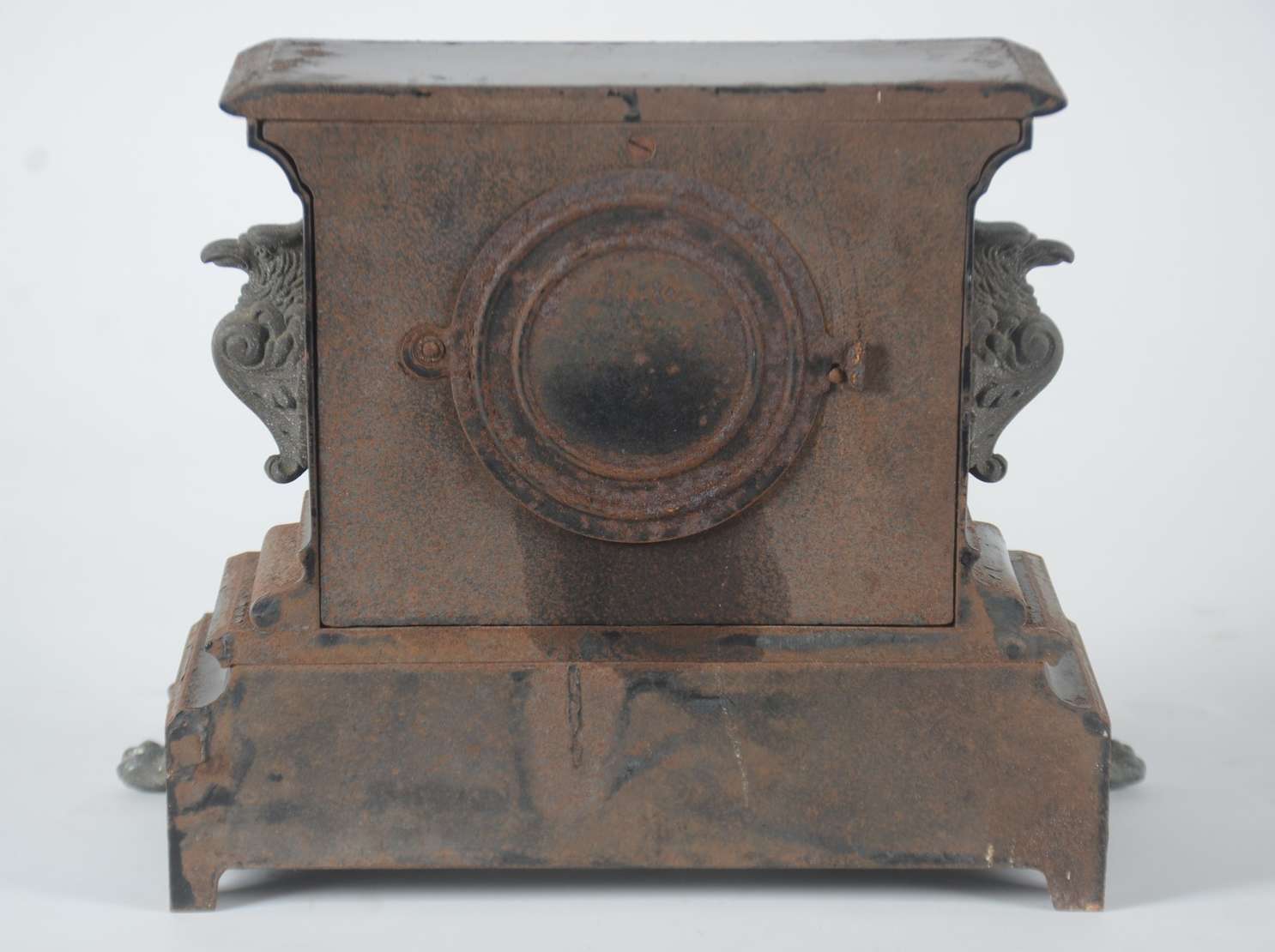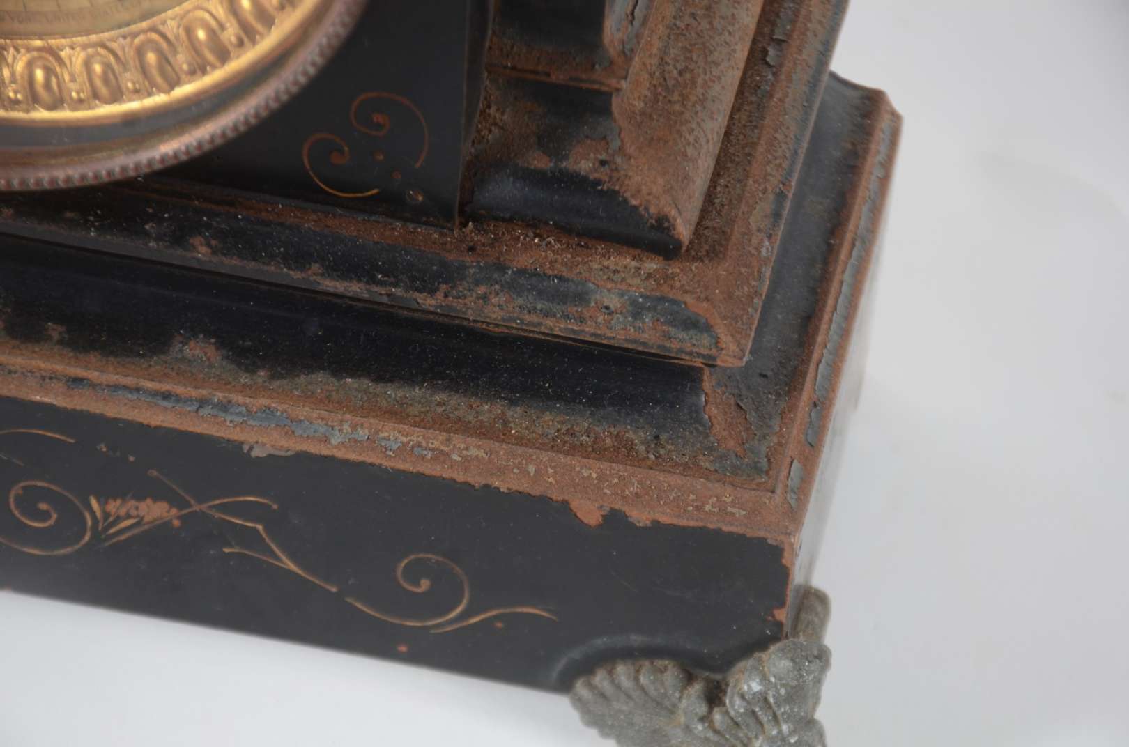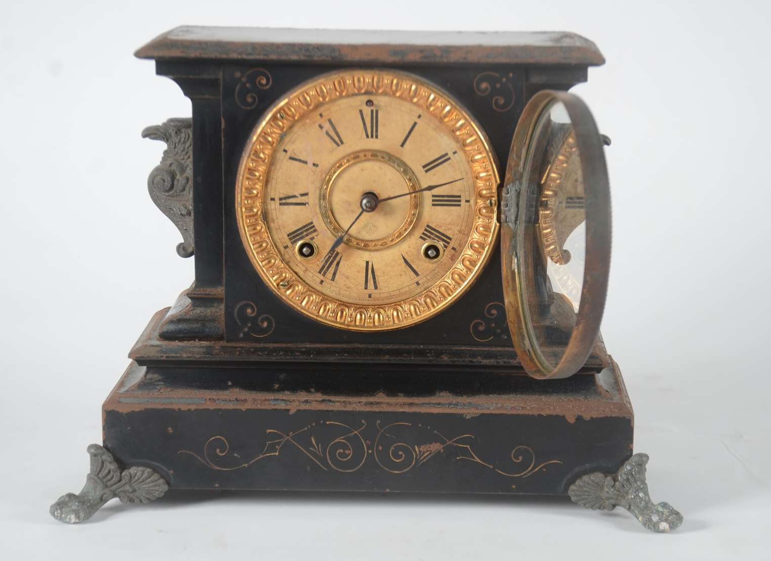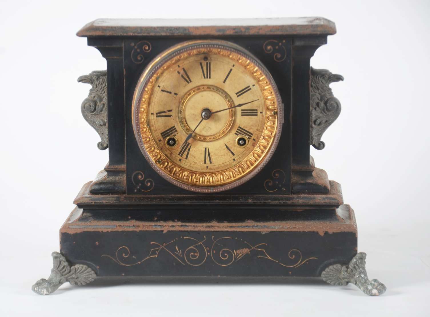 Relógio de coluna com caixa de madeira e mostrador, pêndulo e pesos de metal dourado. Funcionando, mas precisando de ...