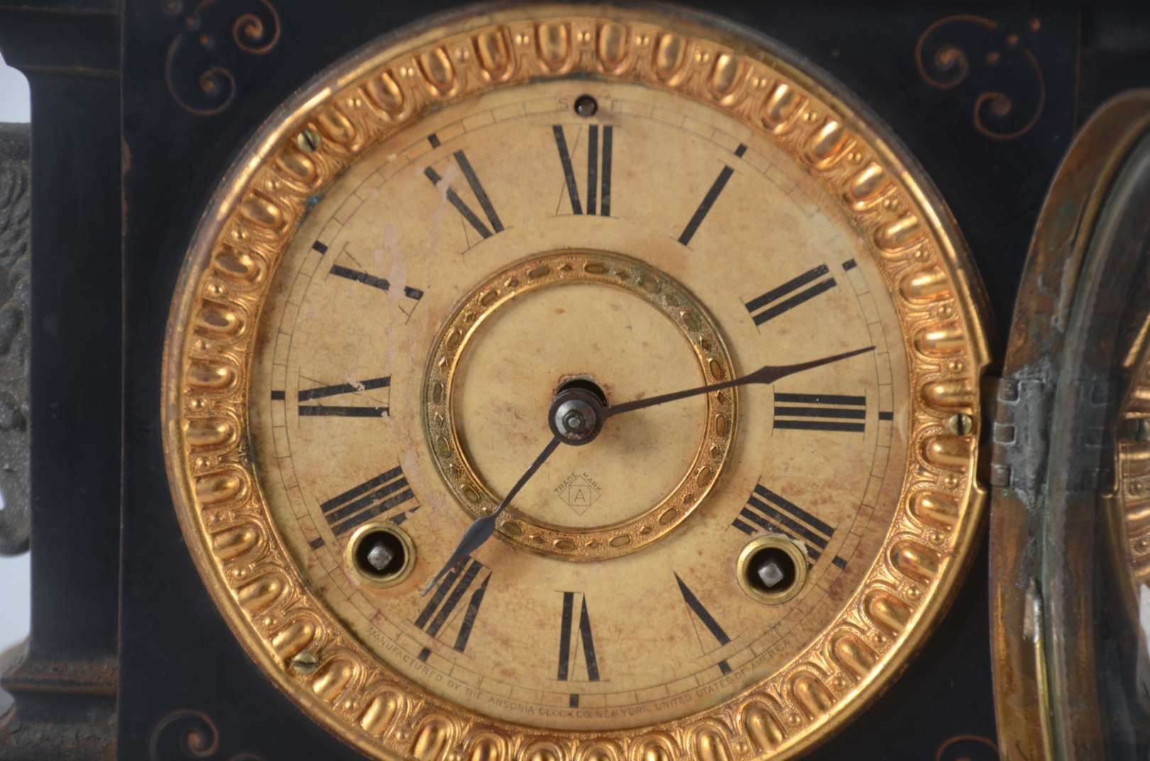 Antigo gongo oriental para cerimonial em metal, guarnecido com par de presas de marfim. Base em madeira. Acompanha ba...
