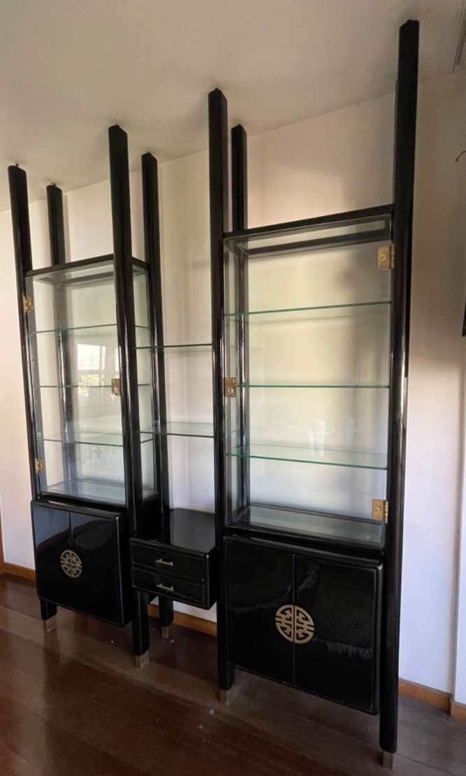 Porta bibelot de parede em madeira ricamente entalhada, duas prateleiras e detalhes vazados.