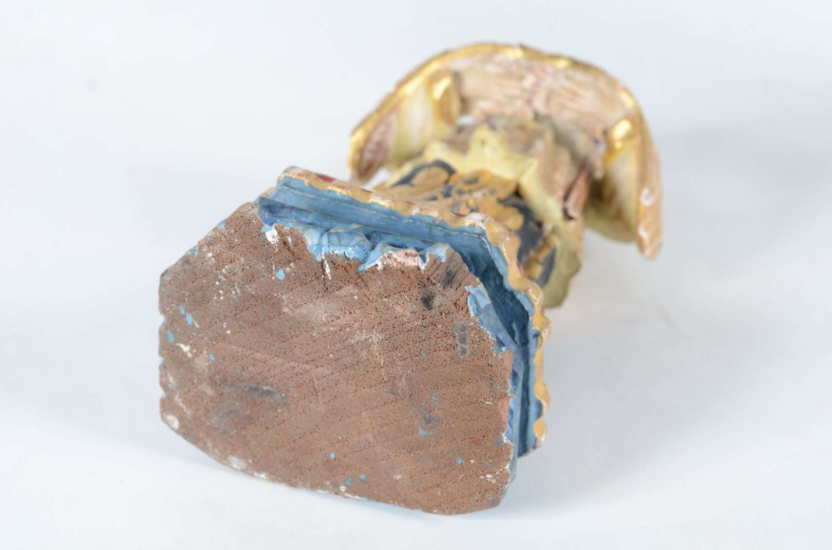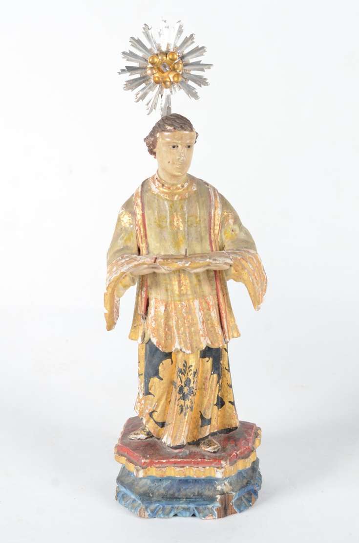 São Francisco - Imagem de madeira policromada com realces dourados, resplendor de prata. Base com uma das quinas rach...