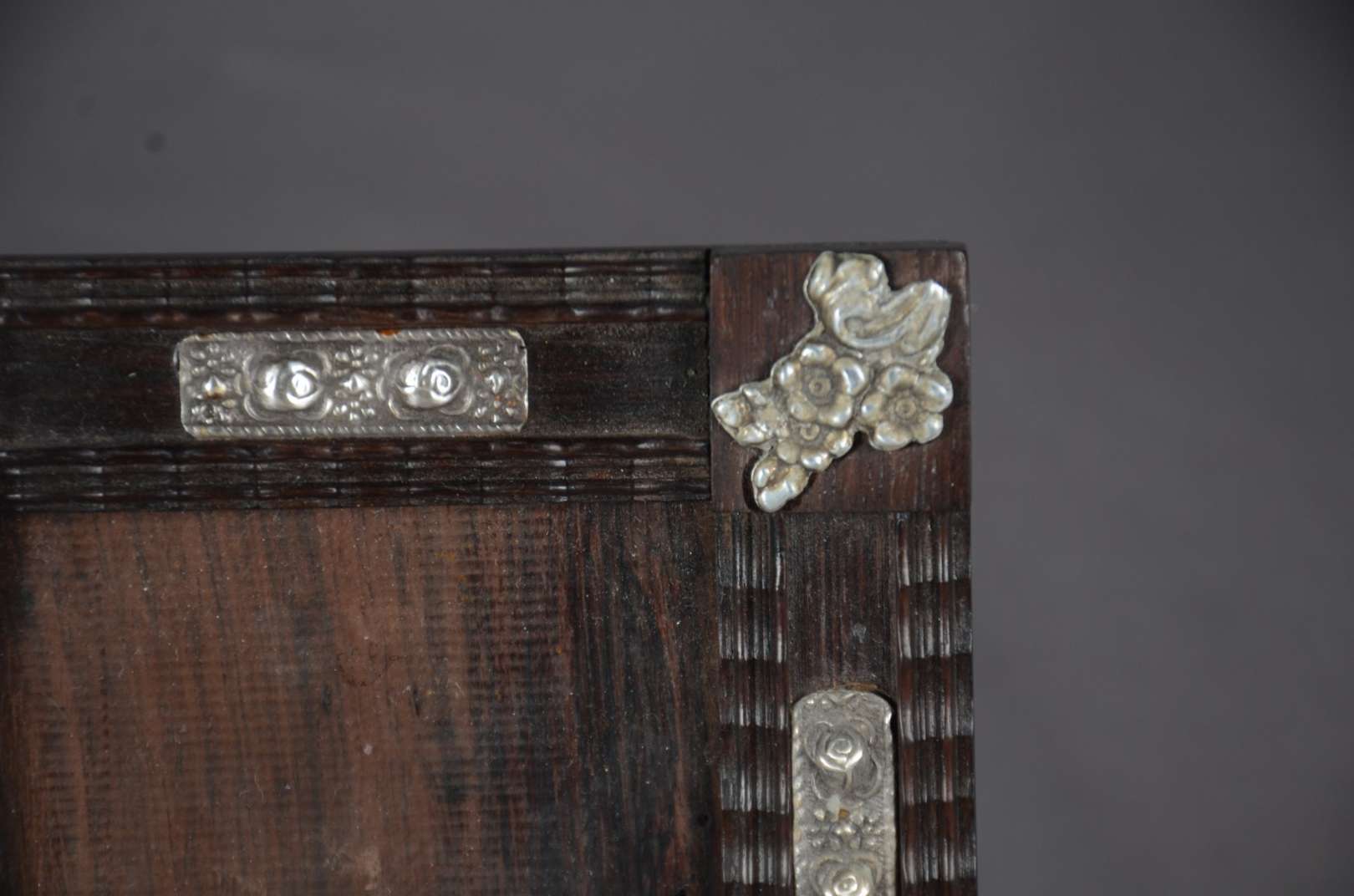 Caixa porta jóias de prata portuguesa repuxada e cinzelada com motivos florais, parte interna de madeira com forracão...