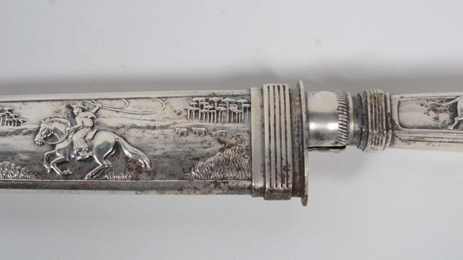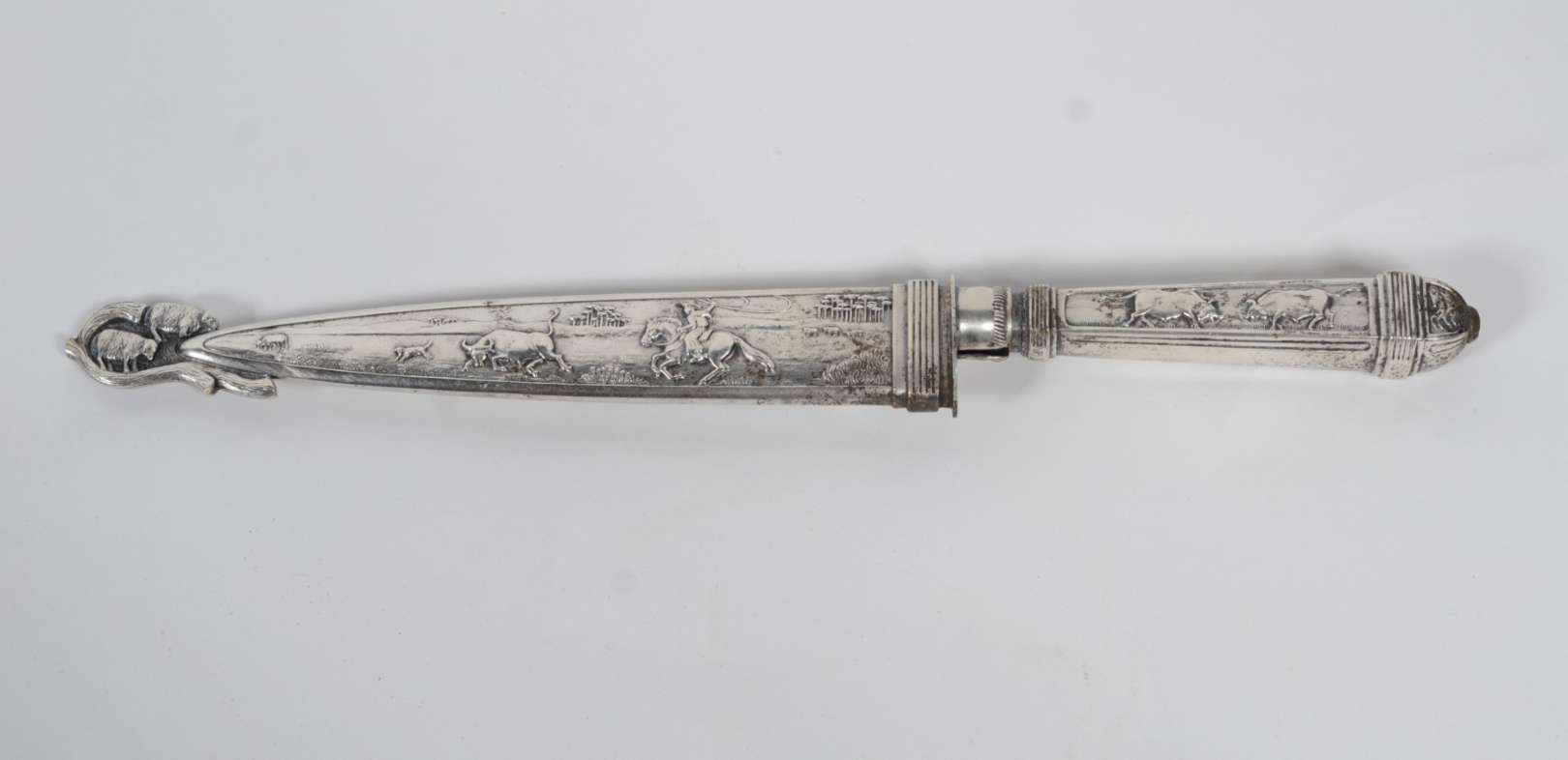 Diversas peças, sendo: par de cachorros de metal, telefone antigo (oxidado) e estatueta no feitio de "pé" em bronze a...