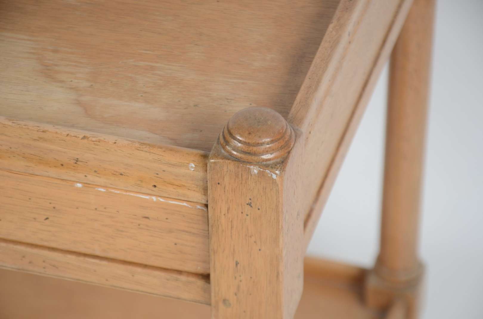 Baú em madeira clara, ferragens aparentes.