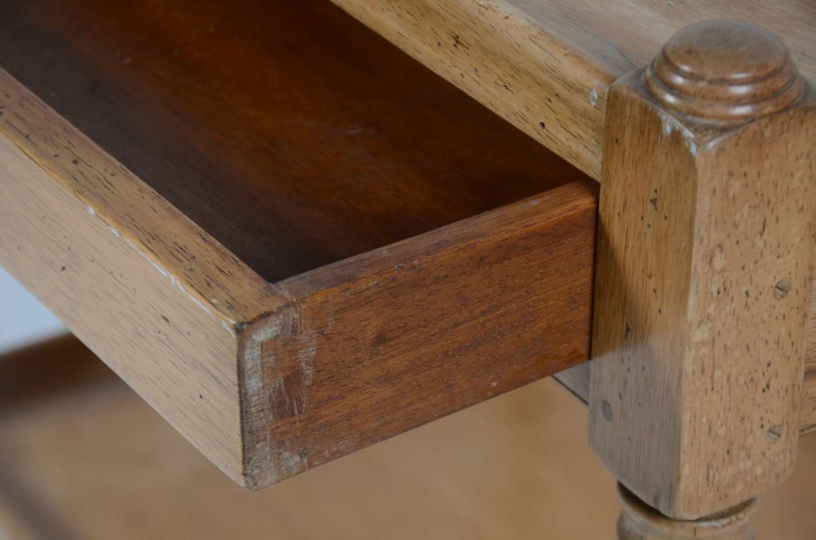 Par de colunas de madeira entalhada e patinada. Umas delas adaptada para abatjour e faltando o tampo. Desgastes.