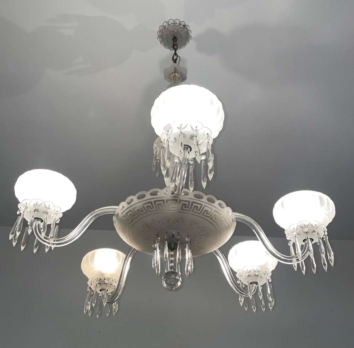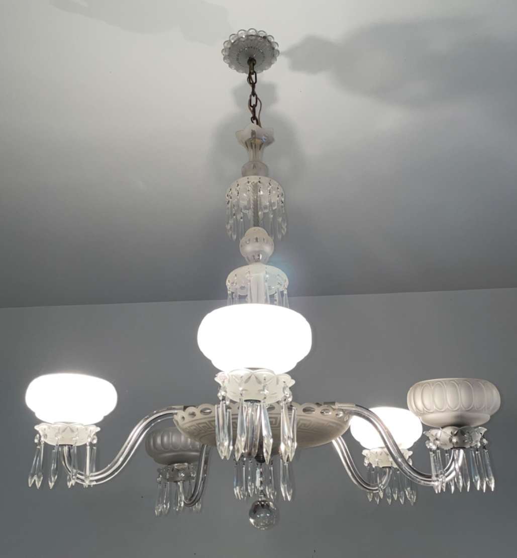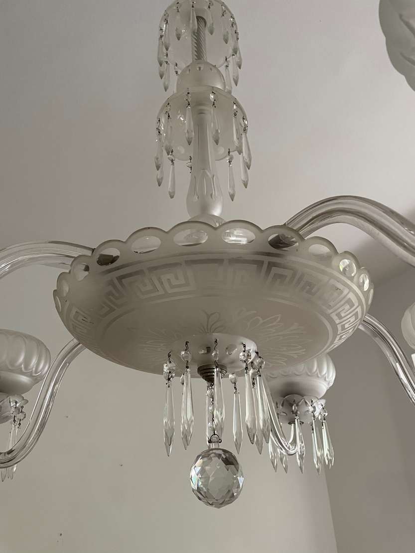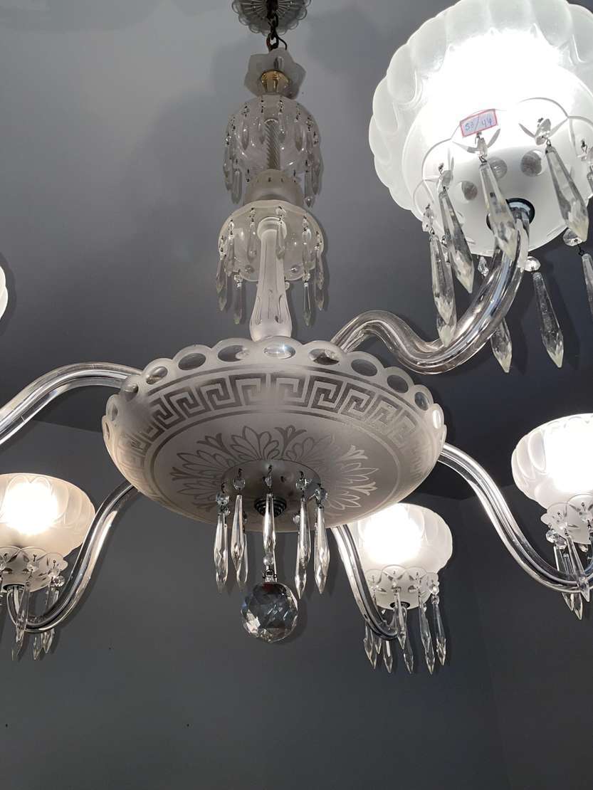 Lustre de cristal doublé rosa para 8 luzes, bobeches com bordas peroladas, pingentes lapidados.