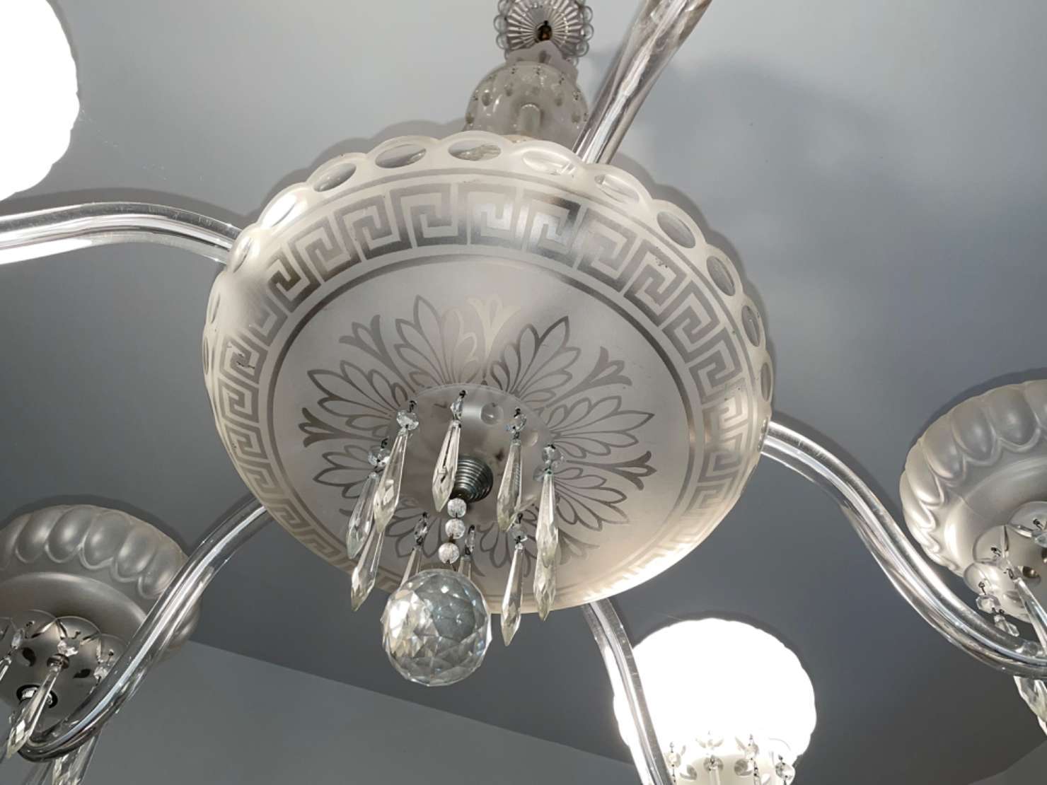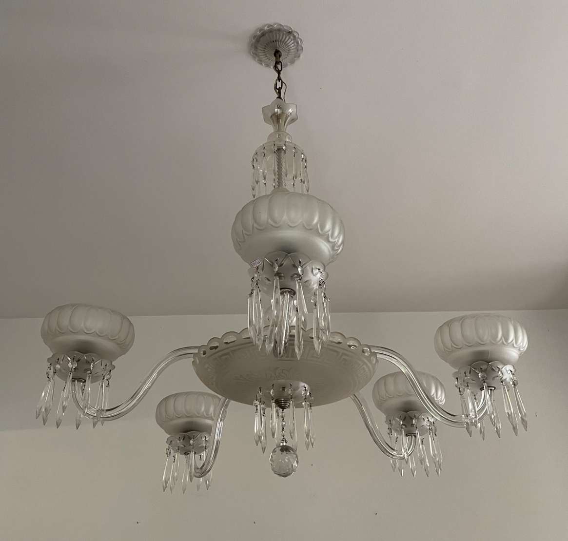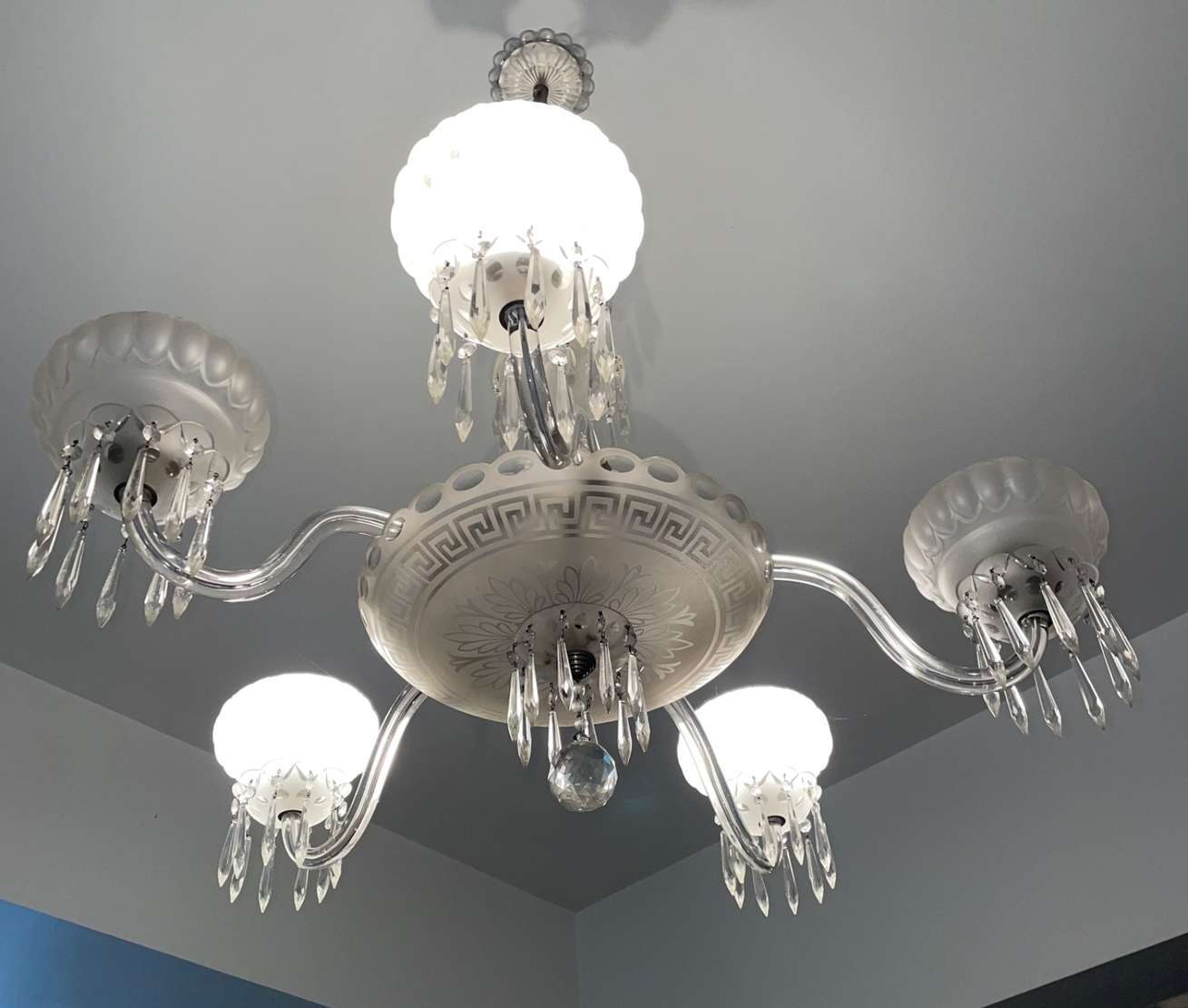 Lustre de cristal doublé rosa para 8 luzes, bobeches com bordas peroladas, pingentes lapidados.