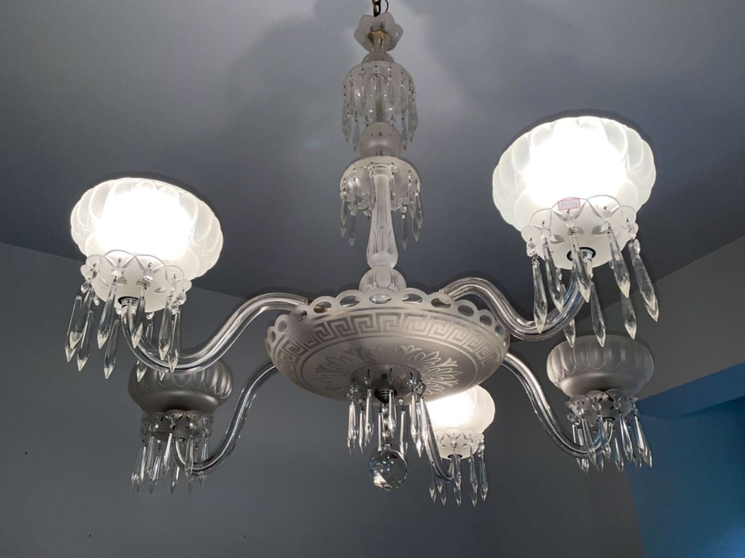 Lampião de opalina branca, manga de cristal lavrado com borda feitio babado em degradé azul.