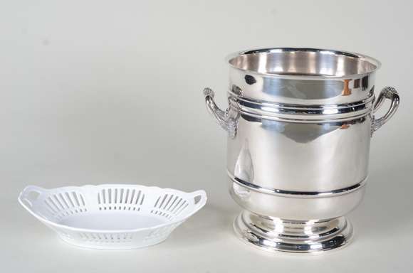 Duas peças, sendo: balde para gelo de metal prateado Christofle e pequena travessa de porcelana branca com vazados.