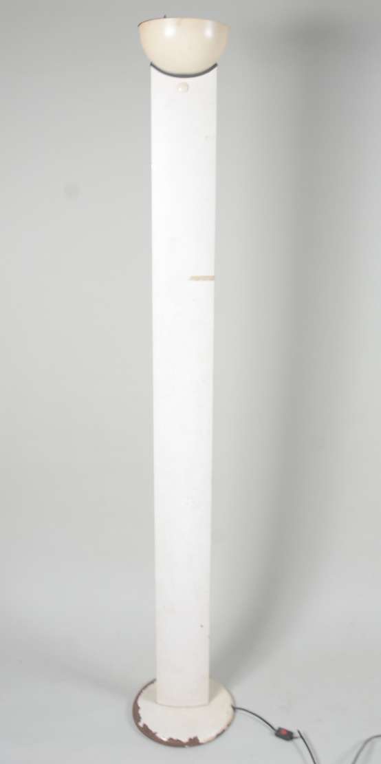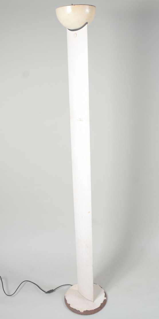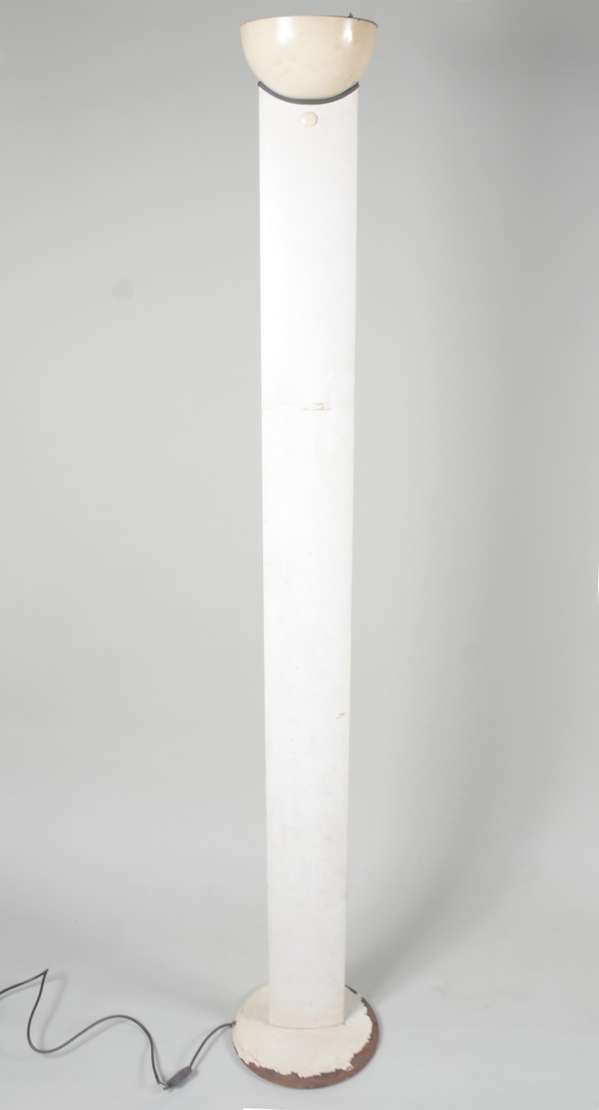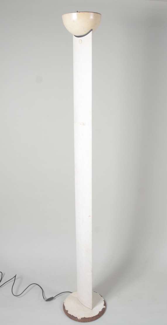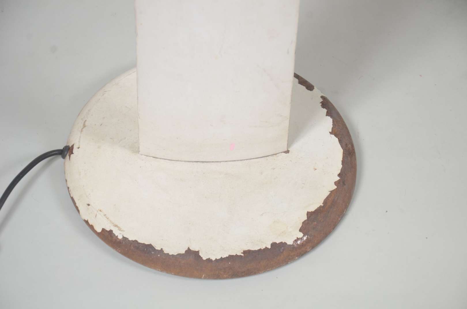Par de antigos tocheiros de pé de metal patinado com meias cúpulas na cor bege. Metal oxidado com desgastes.