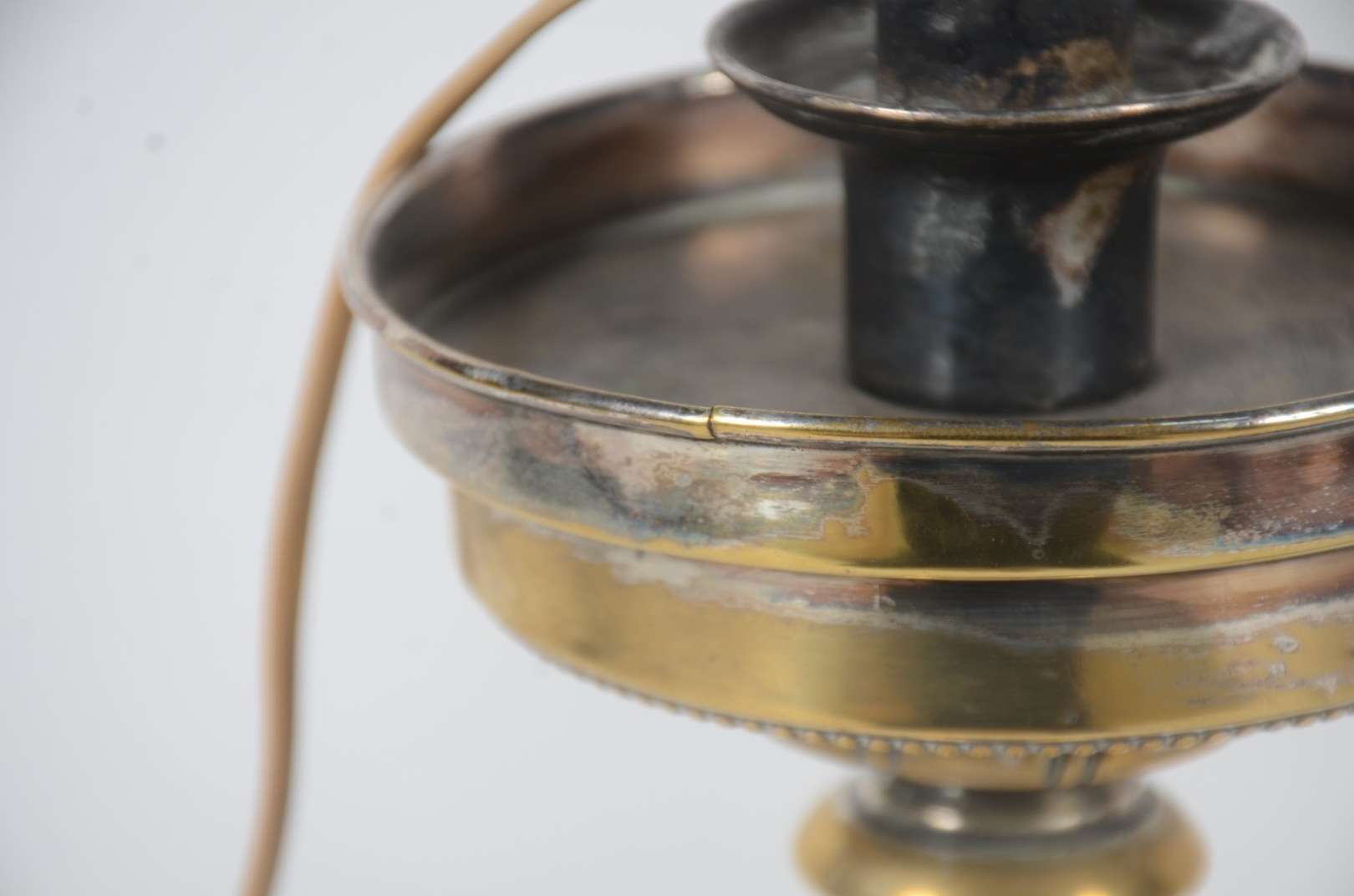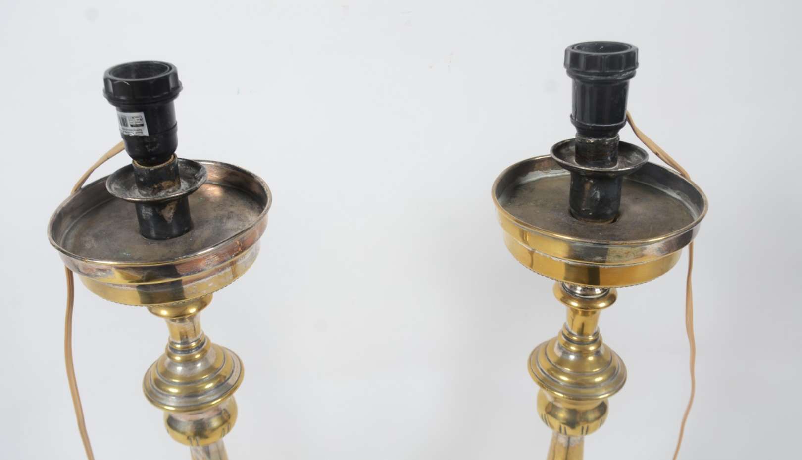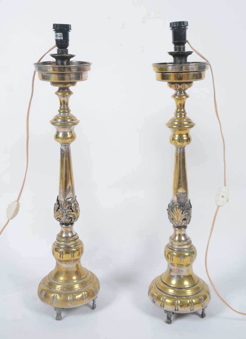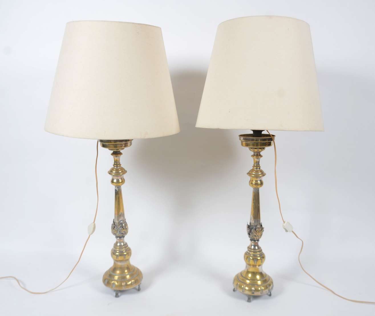 Par de antigos tocheiros de pé de metal patinado com meias cúpulas na cor bege. Metal oxidado com desgastes.