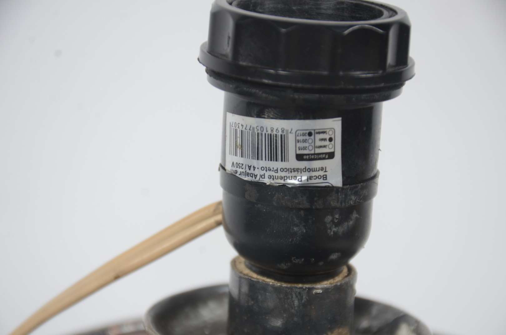 Abatjour de cerâmica policromada, com vazados. Metal com oxidações. Borda com parte colada. Acompanha cúpula.
