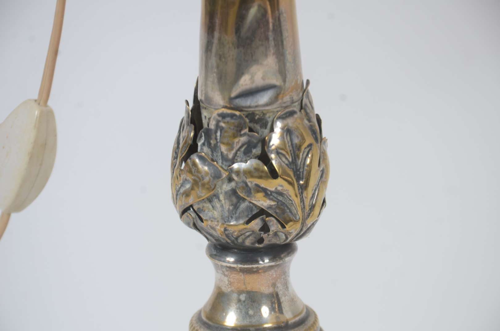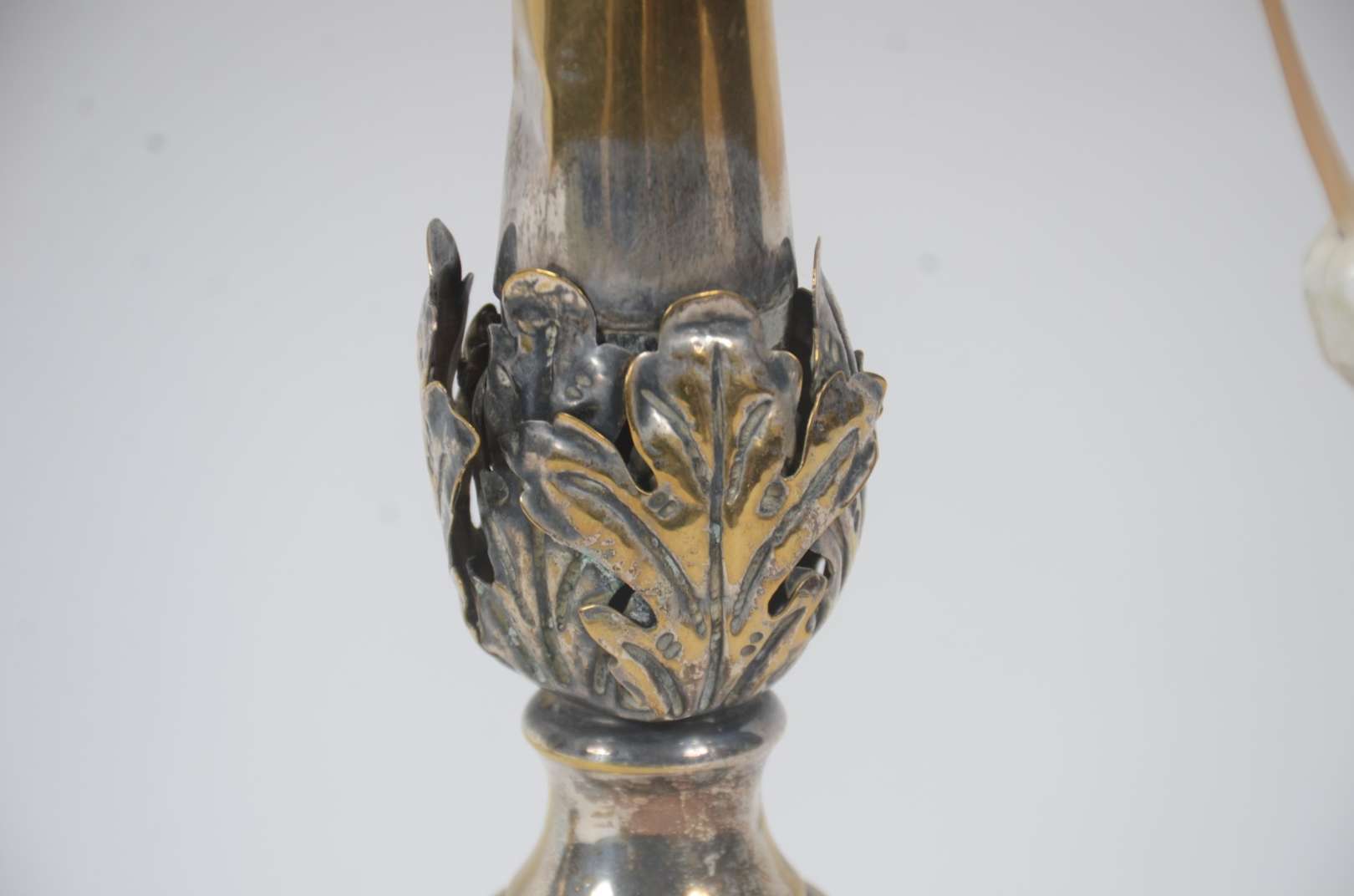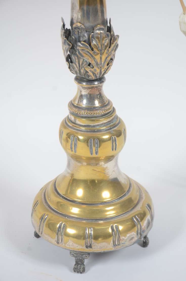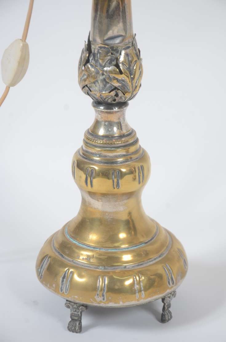 Luminária na forma de tocheiro em estanho, manga de vidro fosco.