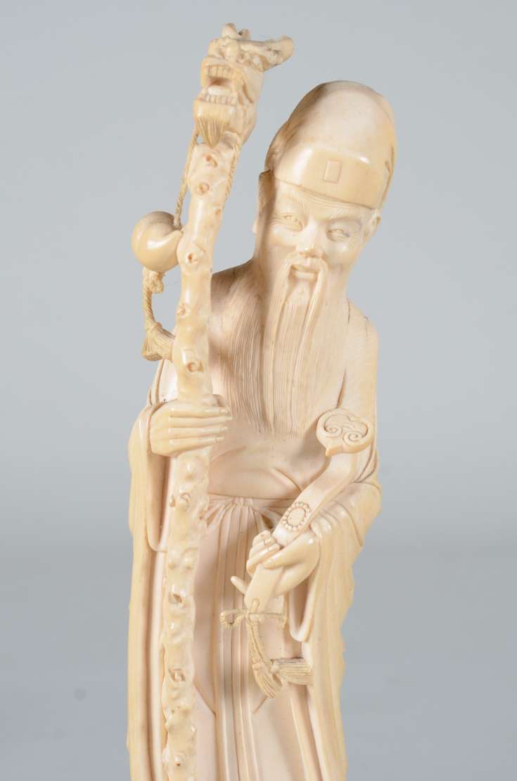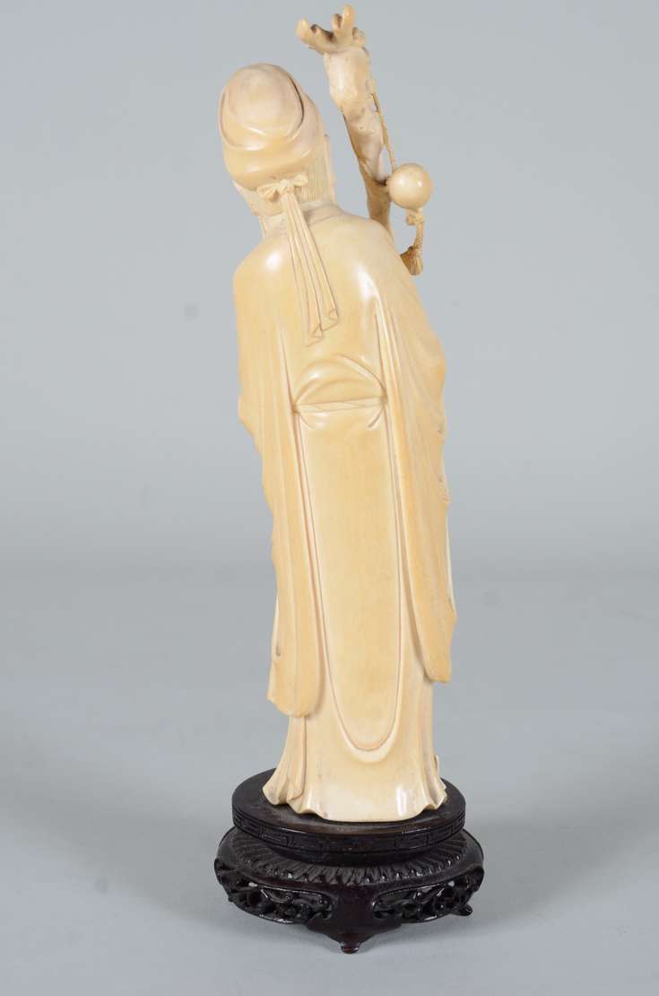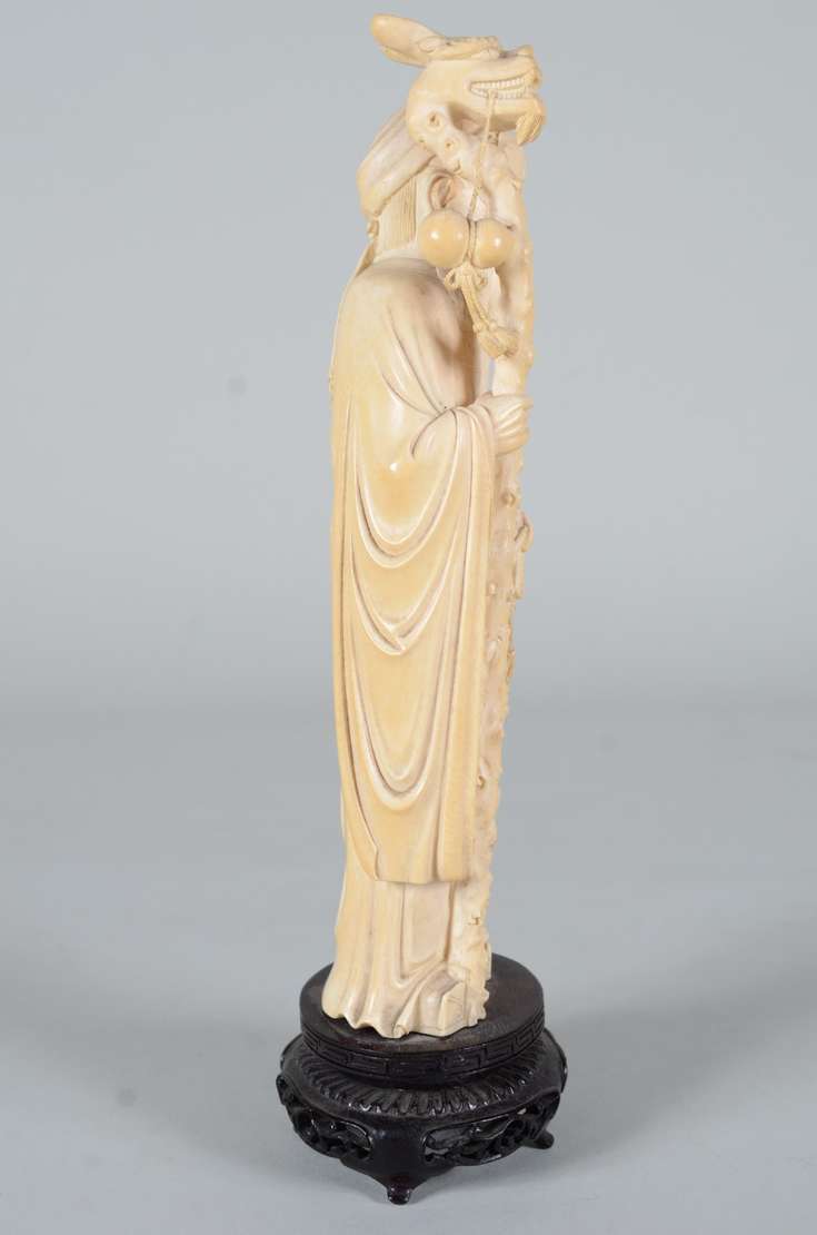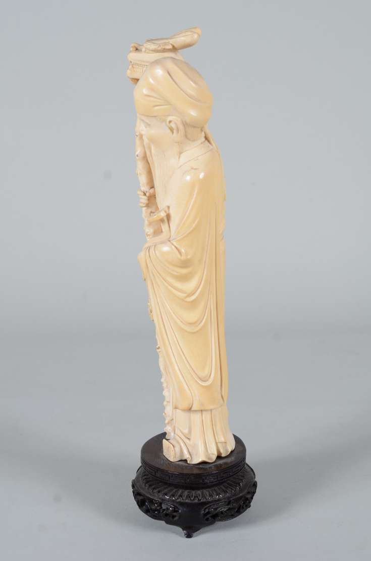 Escultura de marfim oriental representando gueixa, resquícios de policromia, base de madeira entalhada. Pequenas rach...