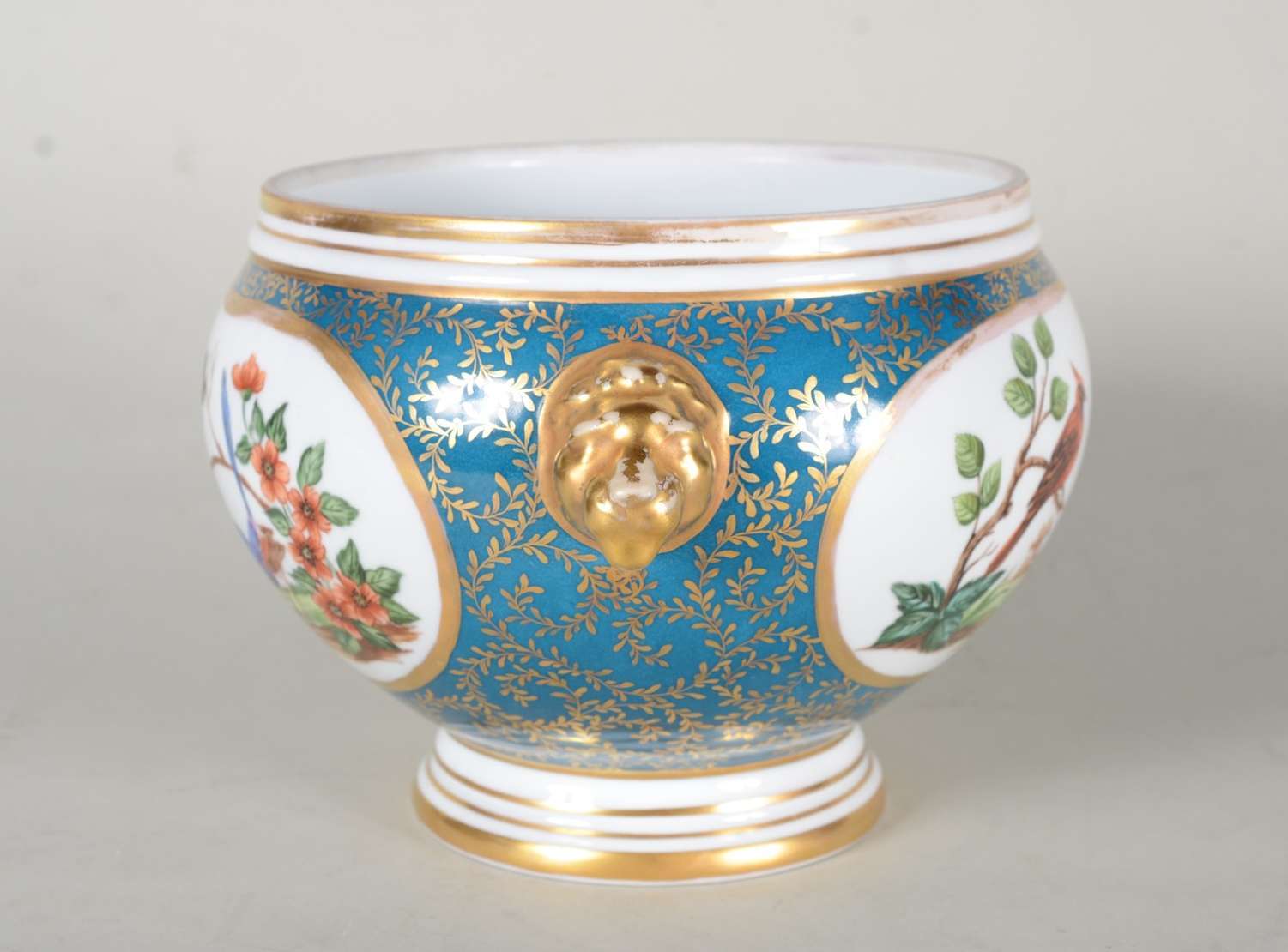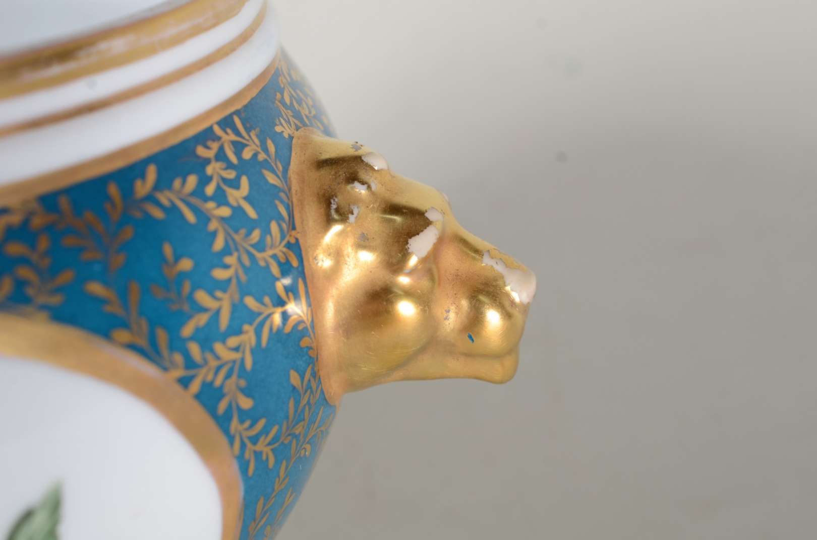 Vaso de porcelana europeia decorado com paisagem em policromia sobre fundo azulado.