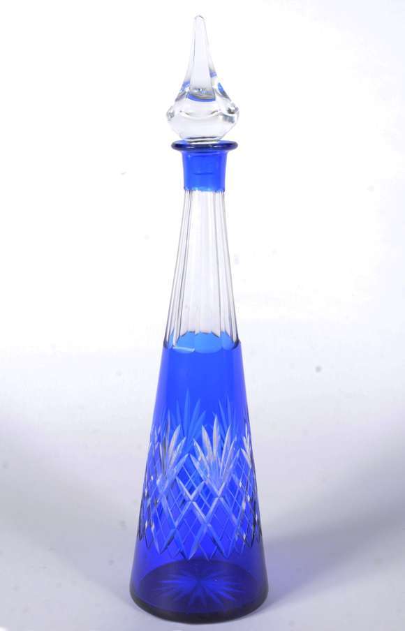 Garrafa de cristal doublé azul lapidada.