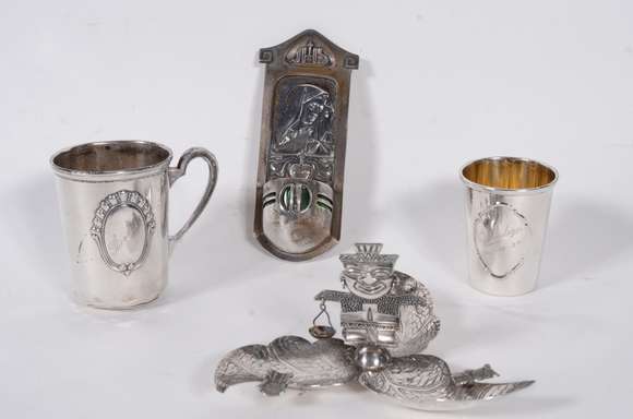 Diversas peças de prata, sendo: 2 copos, porta água benta e cinzeiro. Total: 4 peças. Peso da prata: 190 g. (Por moti...