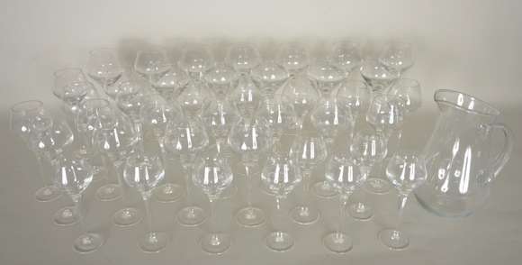 Serviço de cristal, composto de: 12 taças para água, 6 para vinho tinto, 13 para vinho branco, 8 para licor e jarra p...