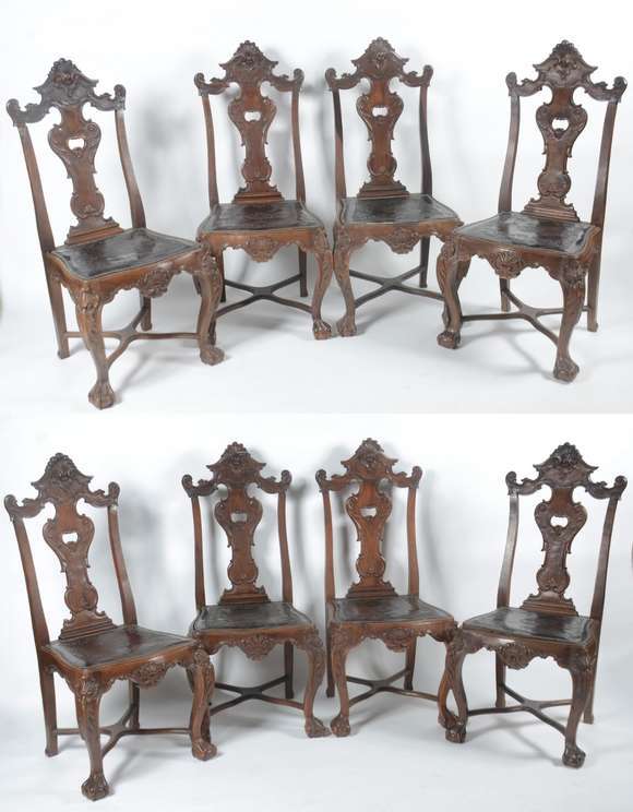 Conjunto com oito cadeiras de madeira nobre, estilo Dom José, ricamente entalhadas, assentos de couro pirogravado e t...