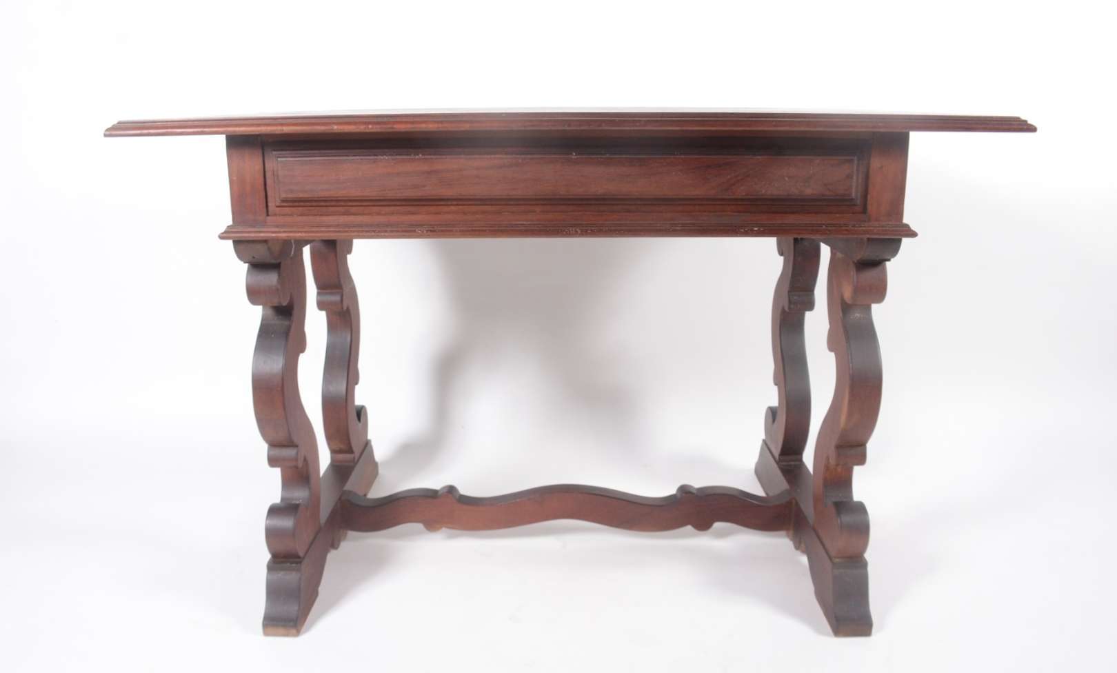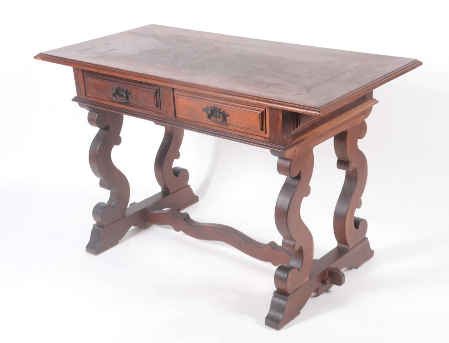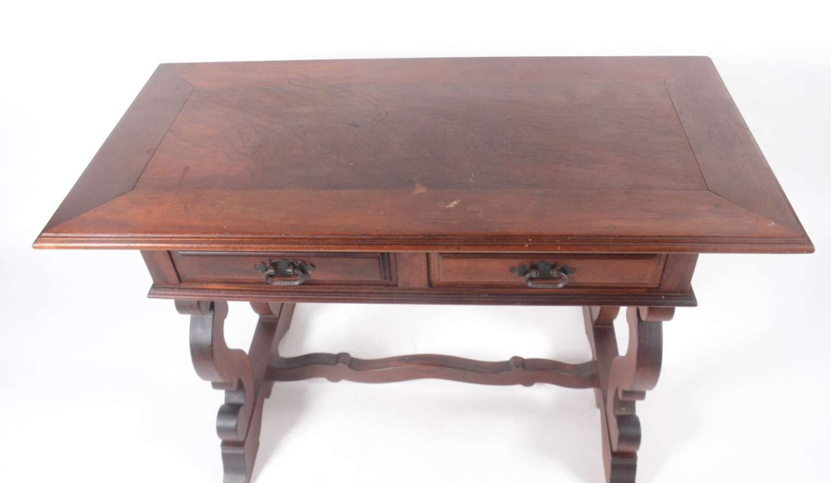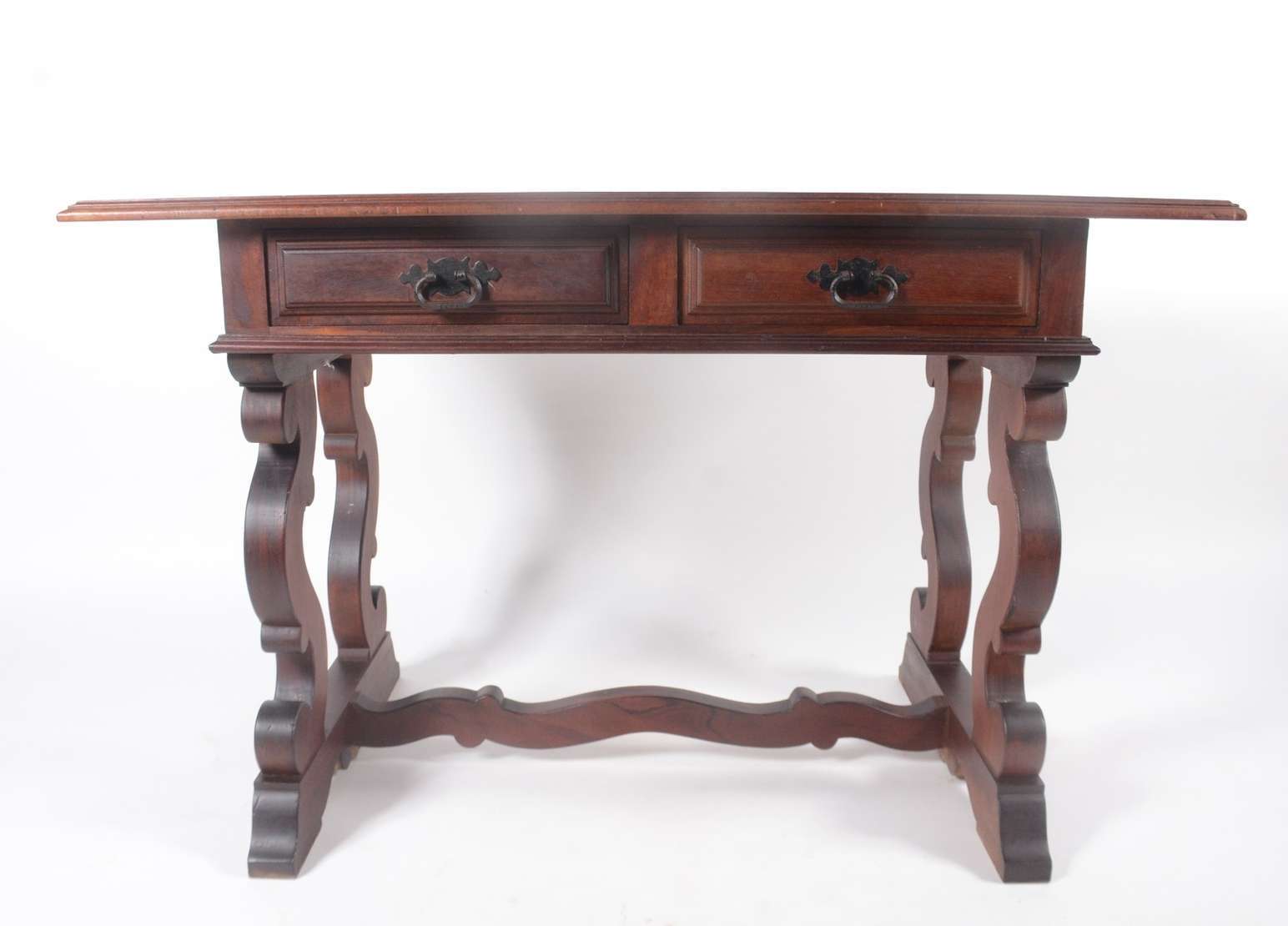 Mesa auxiliar de madeira nobre filetada com 2 gavetas, pernas retas ligadas por platô inferior. Pequenos desgastes.
