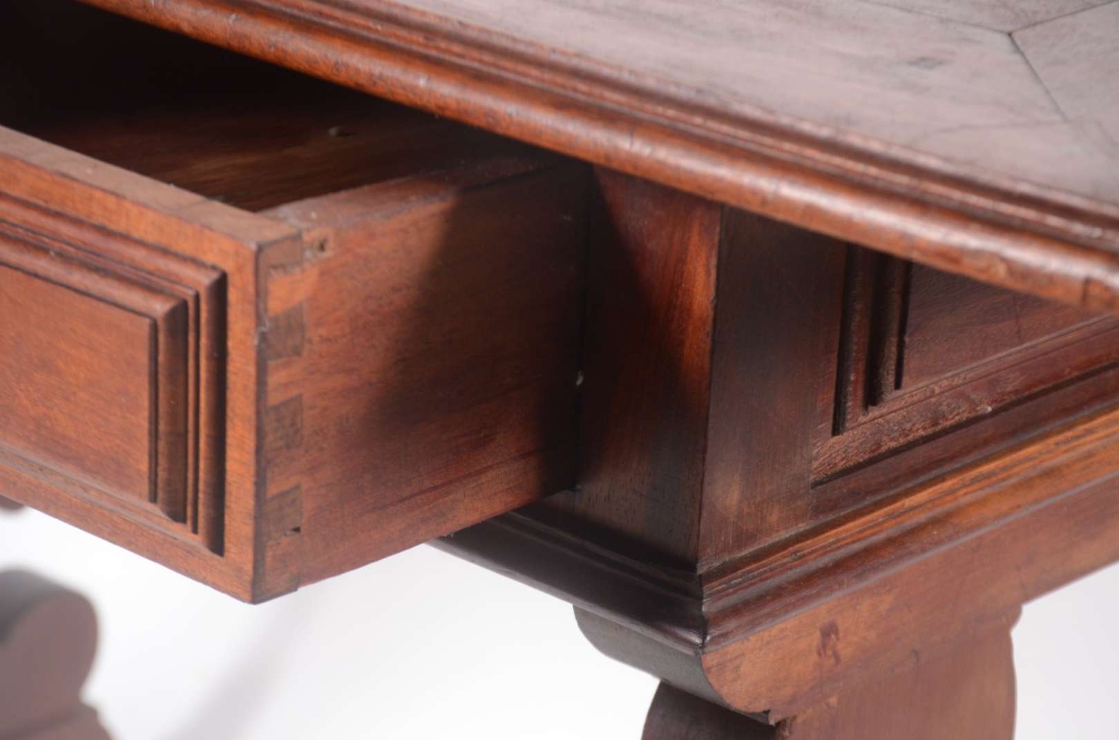 Mesa auxiliar de madeira nobre, tampo feitio retangular tendo 3 gavetas com detalhes "em leques" e puxadores de metal...