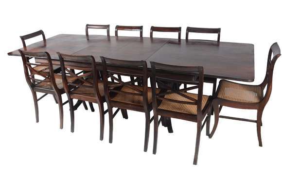 Mesa de jantar de jacarandá com 2 tábuas extensoras, medindo cada uma 40 cm x 100 cm. Apoio em duplo balaústre canela...