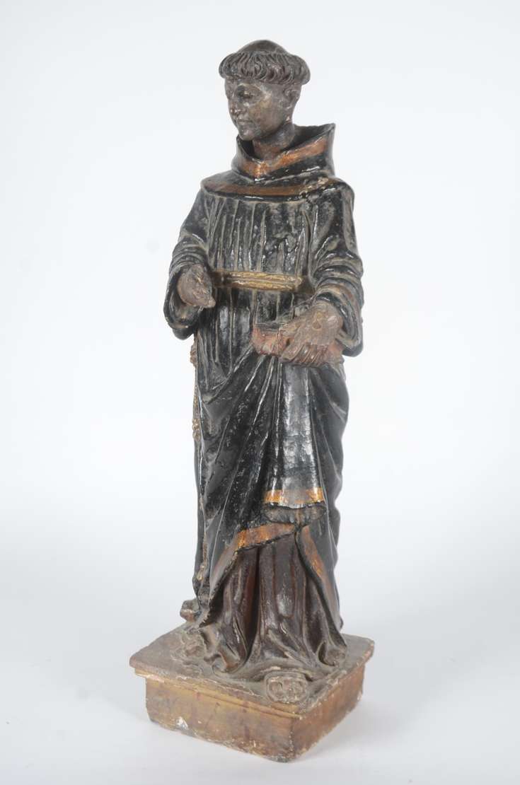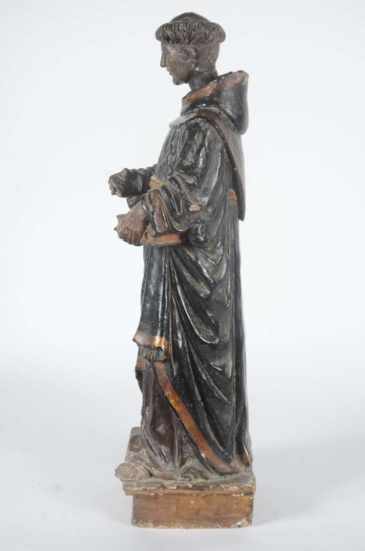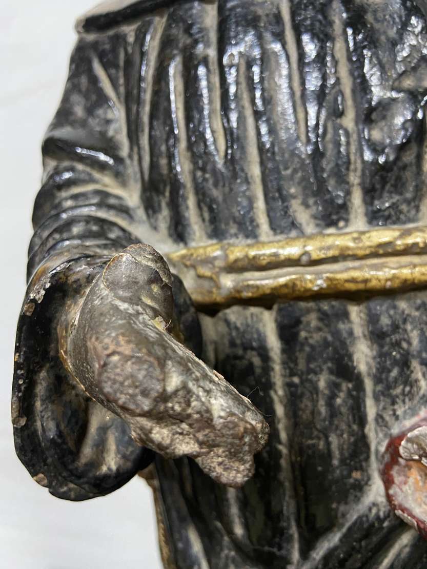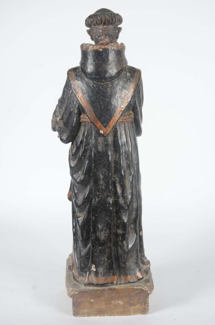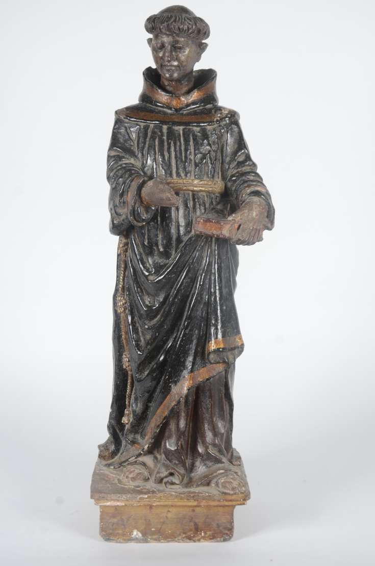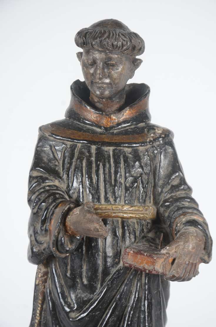 Santo Antônio - Grande e antiga imagem de madeira entalhada e policromada. Cabeça com parte posterior com rachados e faltando pequenas partes. Desgastes. Século XIX.