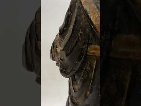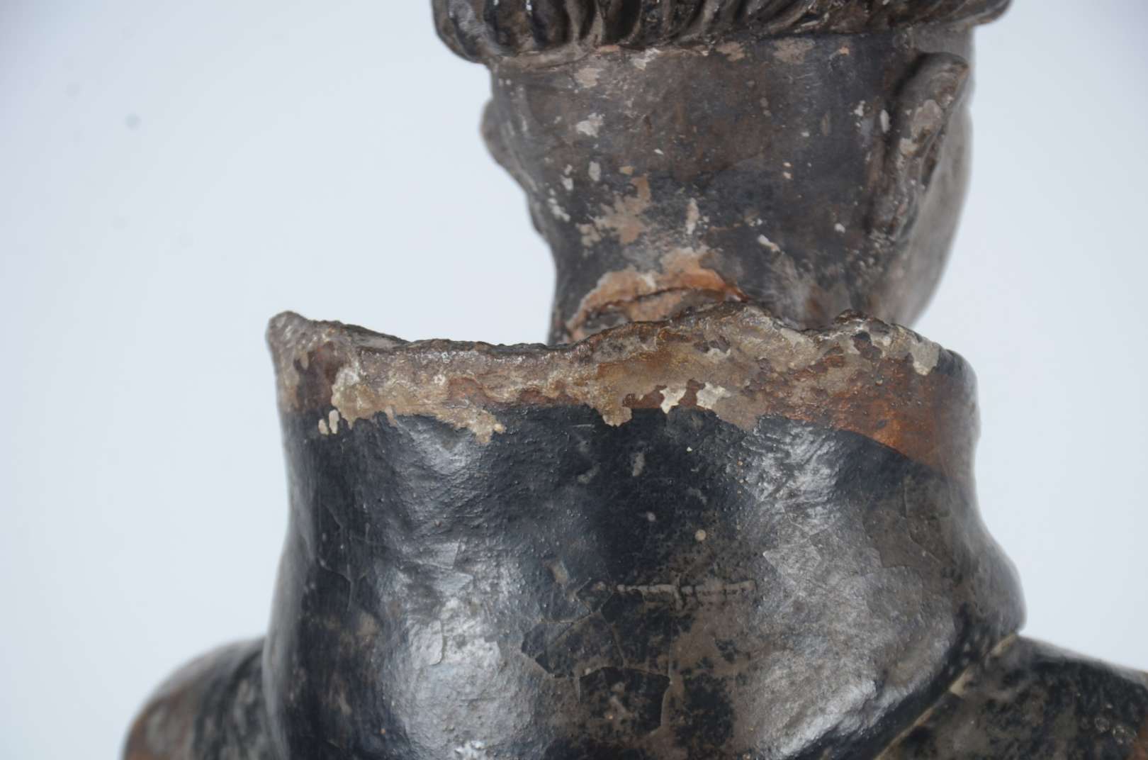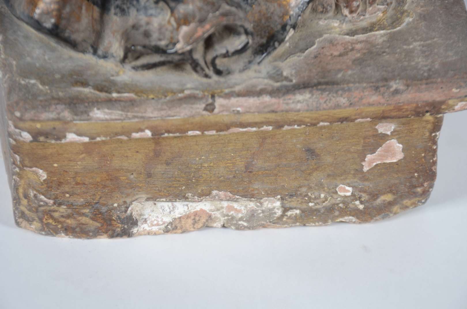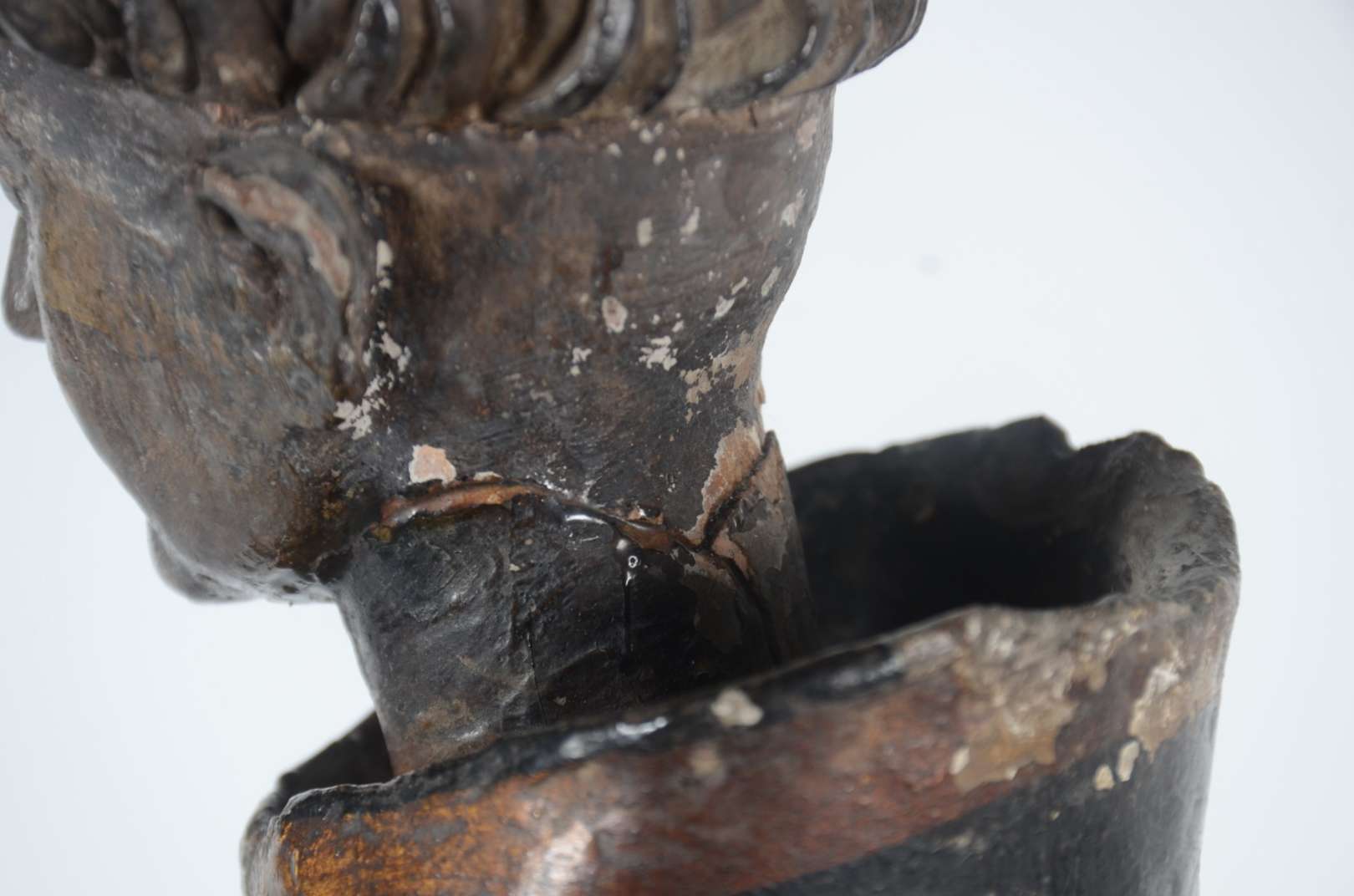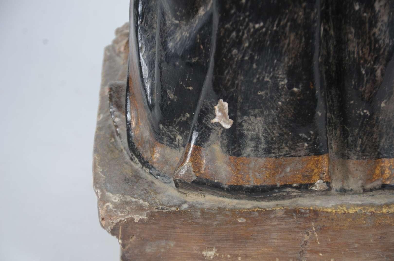 Santo Antônio - Grande e antiga imagem de madeira entalhada e policromada. Cabeça com parte posterior com rachados e faltando pequenas partes. Desgastes. Século XIX.
