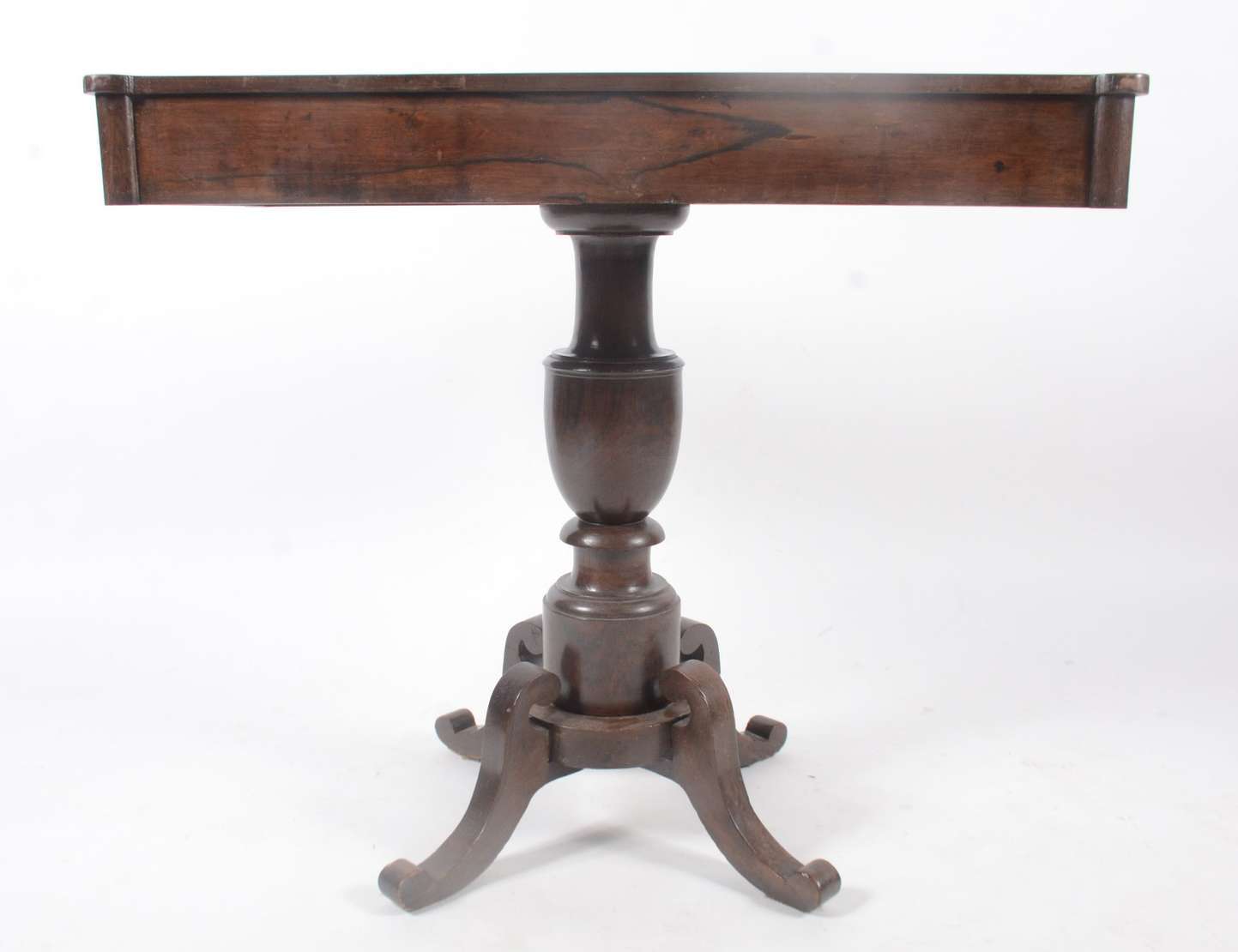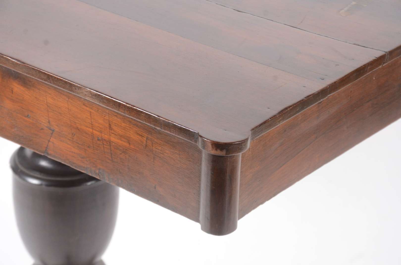 Mesa de jantar de jacarandá com 2 tábuas extensoras, medindo cada uma 40 cm x 100 cm. Apoio em duplo balaústre canela...