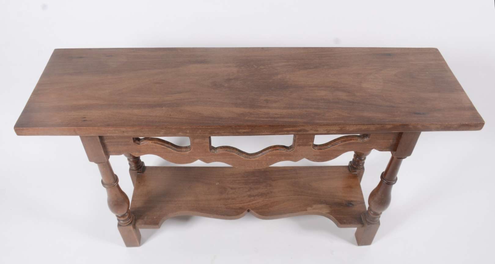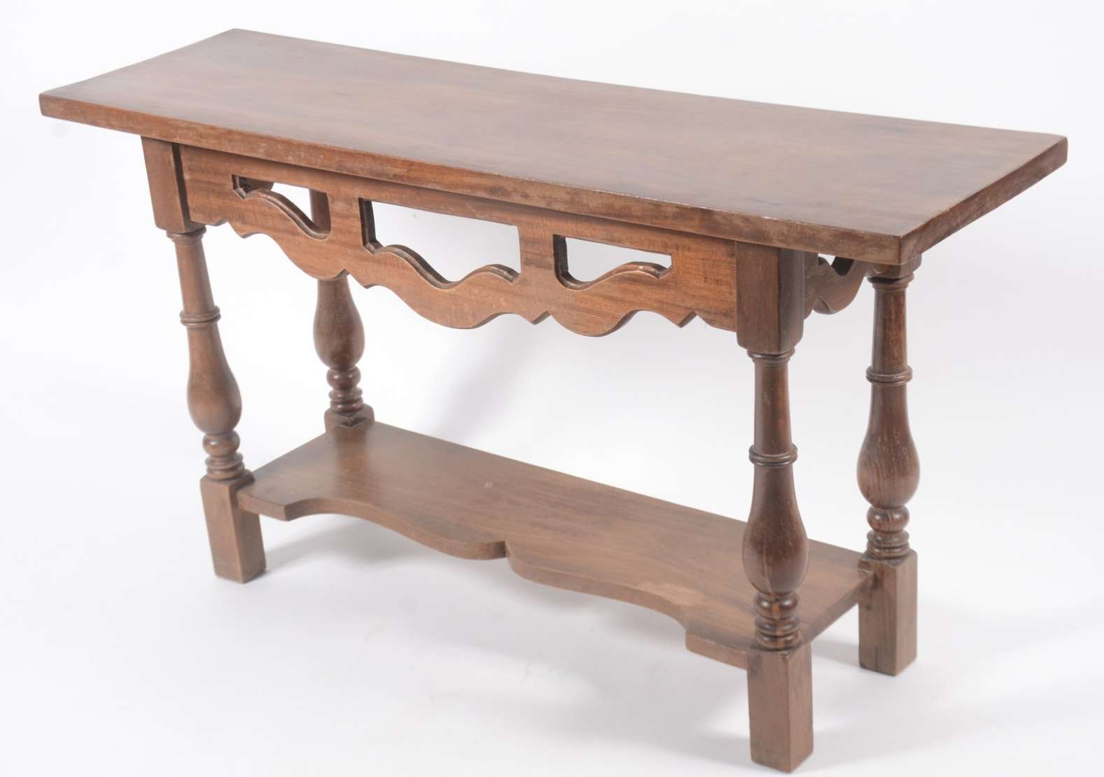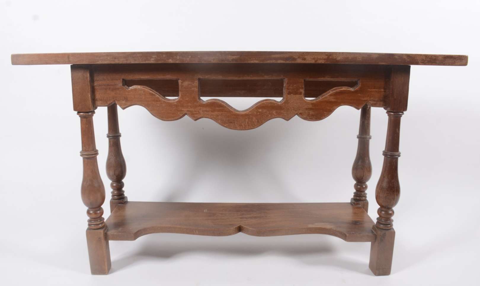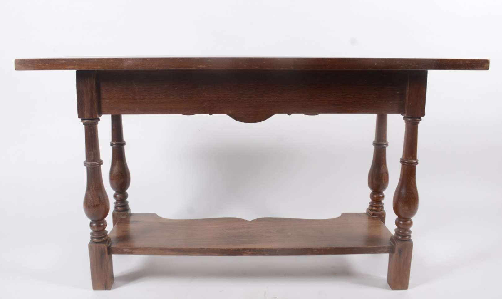 Mesa alta de madeira nobre, tampo retangular apoiado em pernas torneadas ligadas por traves inferiores. Estilo manoel...
