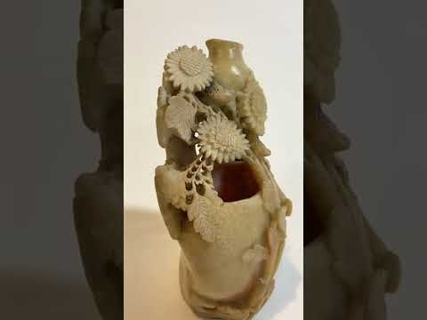 Vaso de vidro decorativo na cor esverdeada com pasta em relevo, borda trabalhada.