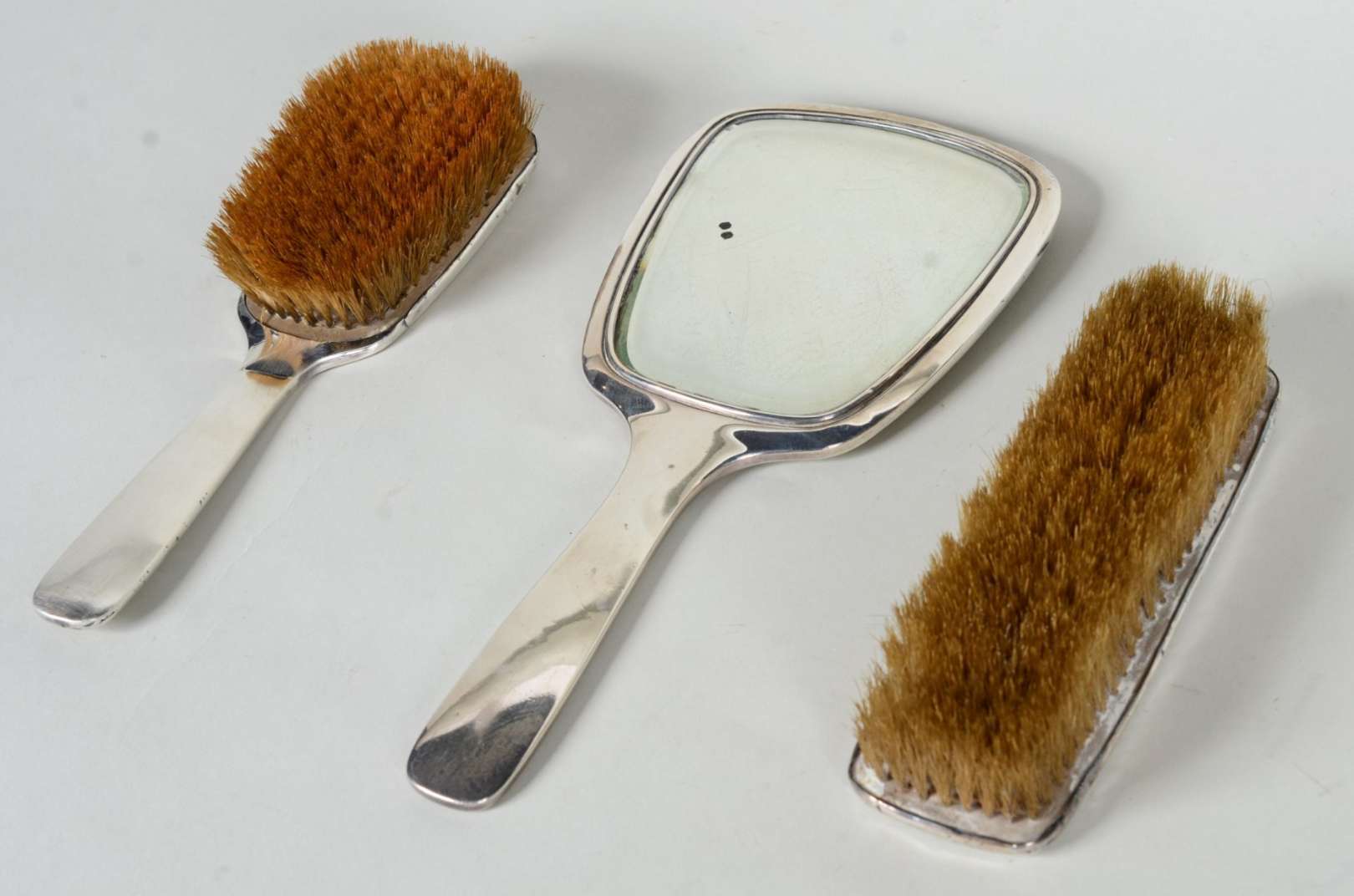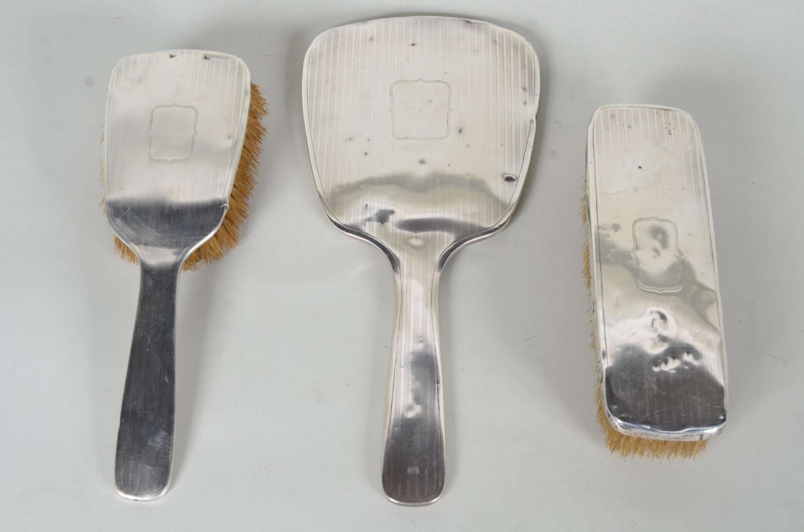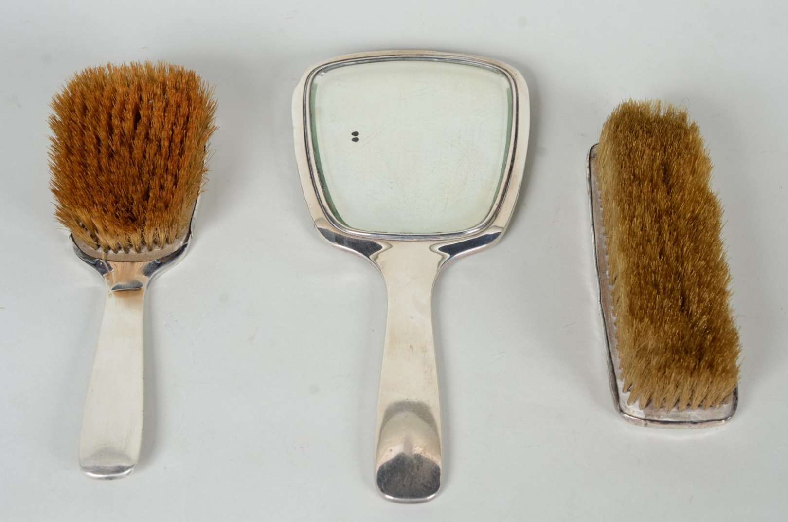 Conjunto para toilette de prata inglesa contrastada, sendo: 3 escovas e espelho. Peso total: 630 g. (Por motivos de s...