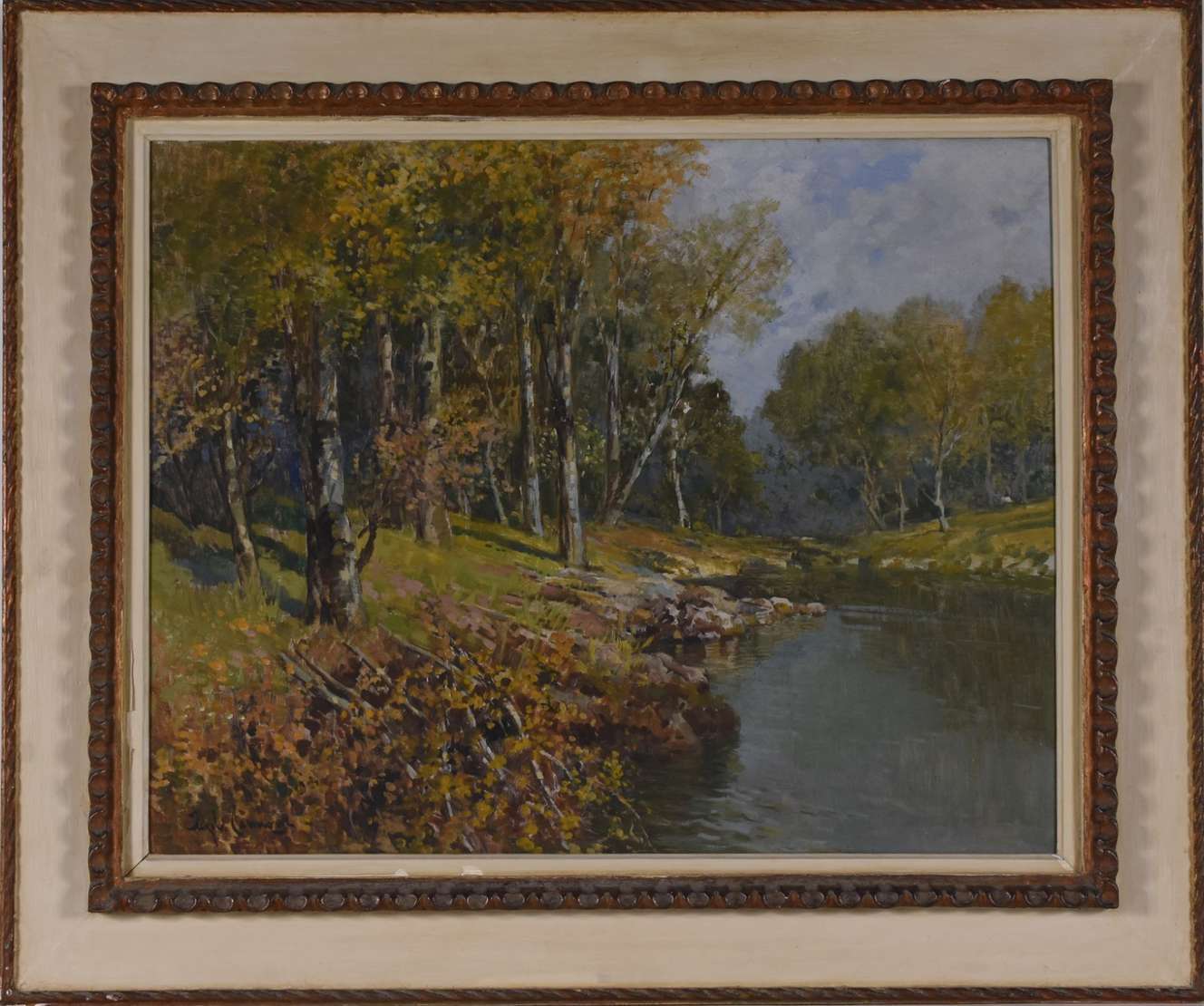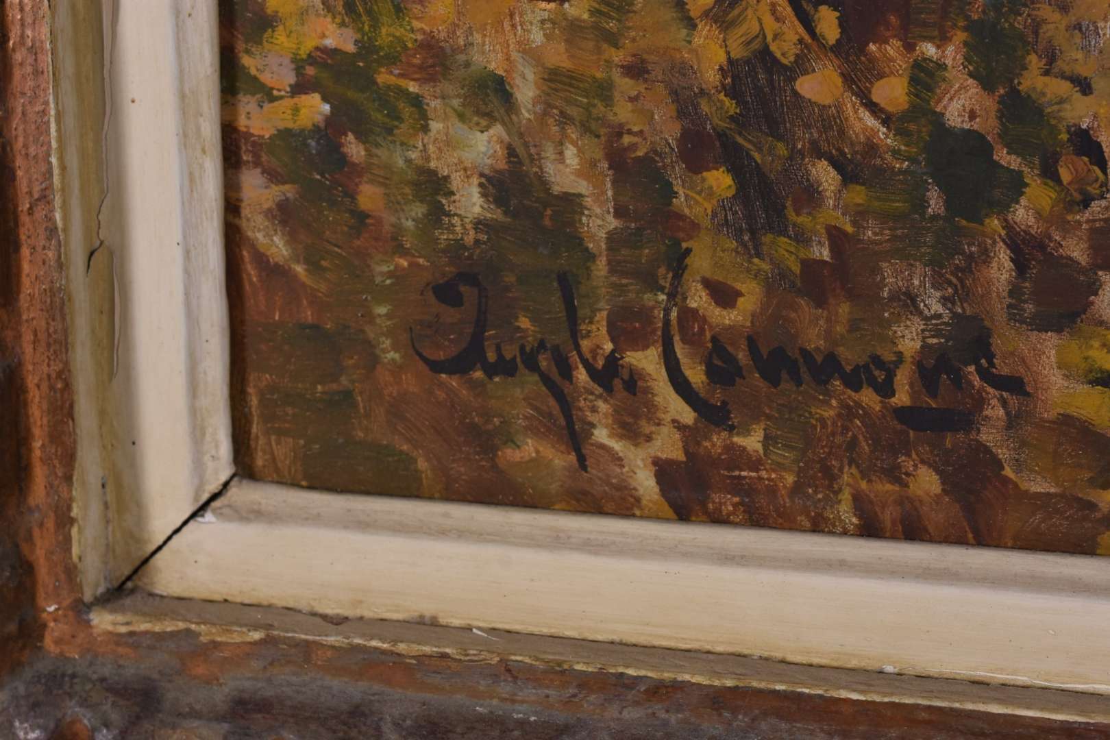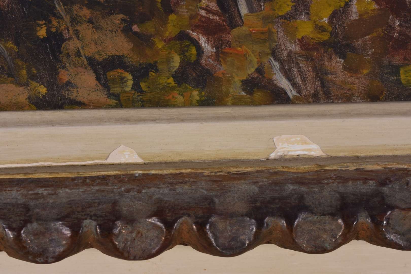 Óleo sobre madeira. Moldura com cupim.