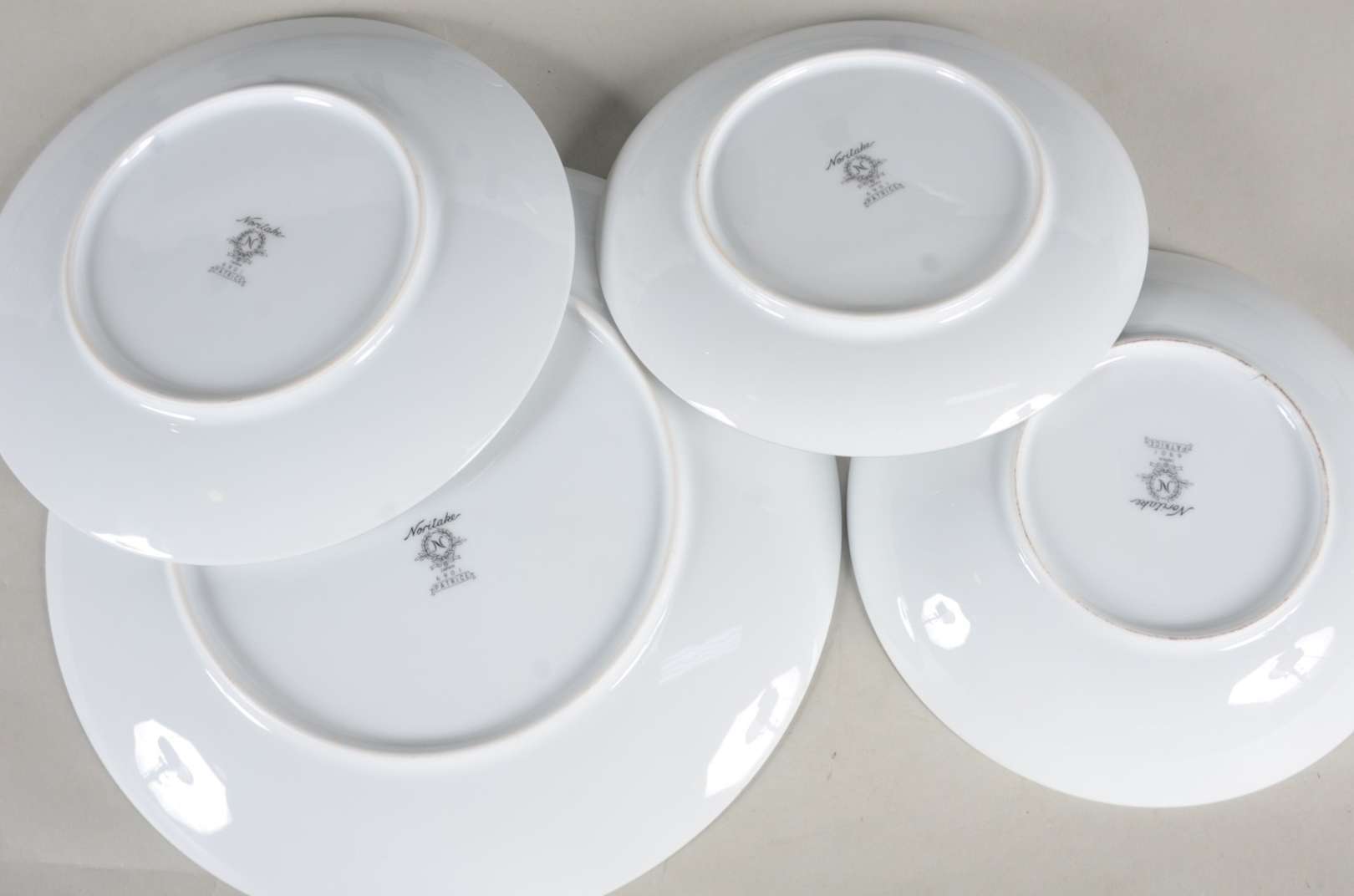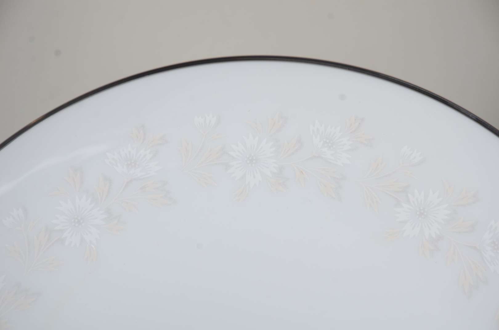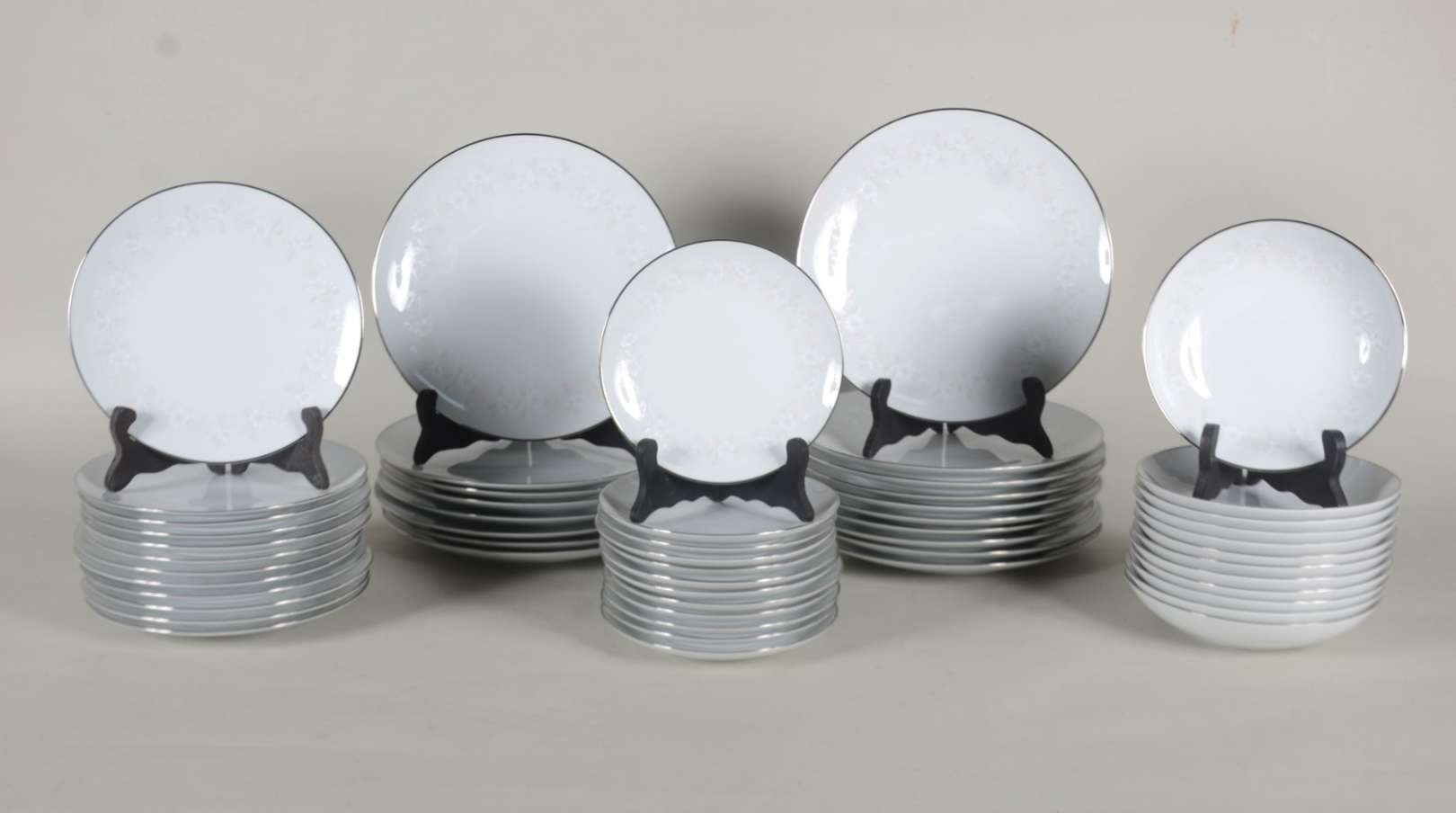 Serviço de jantar de porcelana Noritake branca, borda com flores e frisos prateados, composto de: 18 pratos rasos, 12 pratos fundos, 12 pratos de sobremesa, 12 pratos para pão. Total: 54 peças.