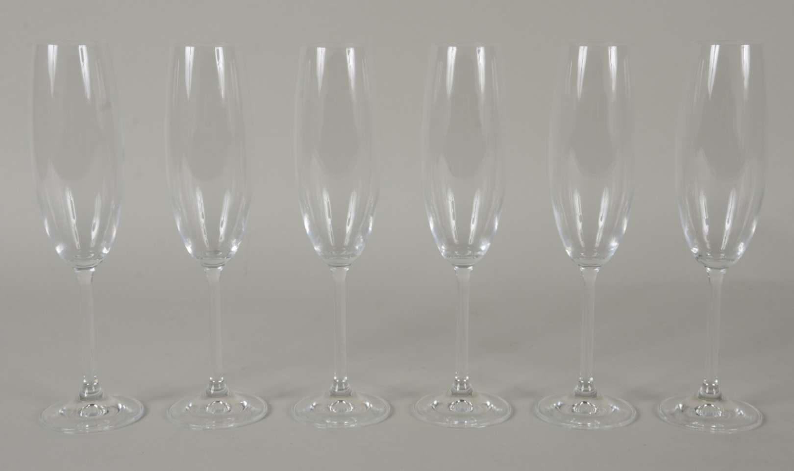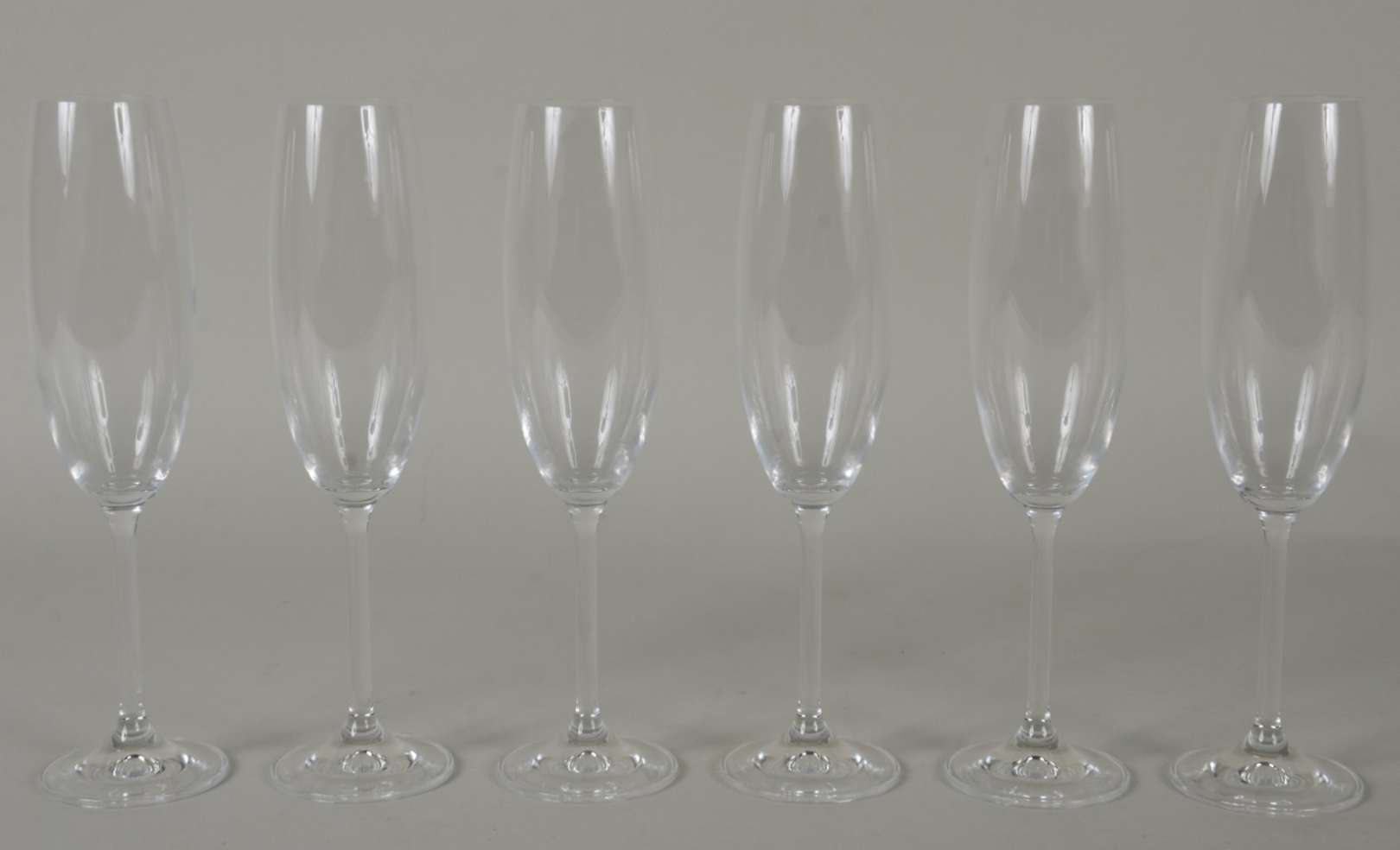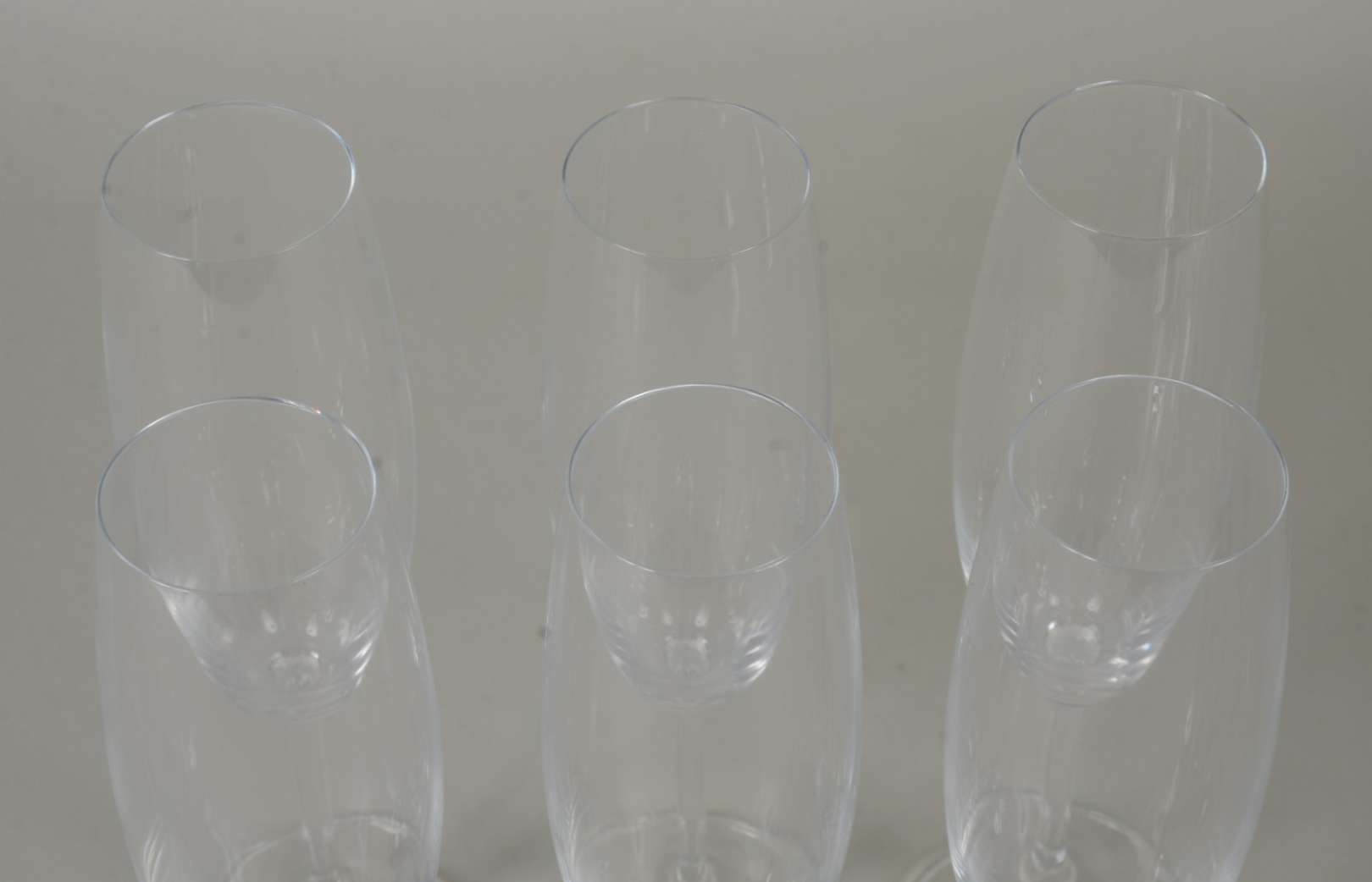 Serviço de cristal belga facetado, base sextavada, composto de: 5 taças para água, 6 para champagne, 2 para vinho bra...