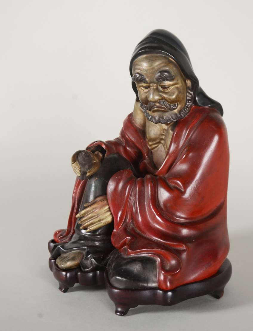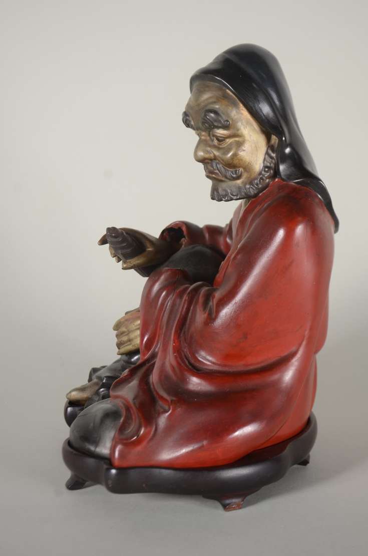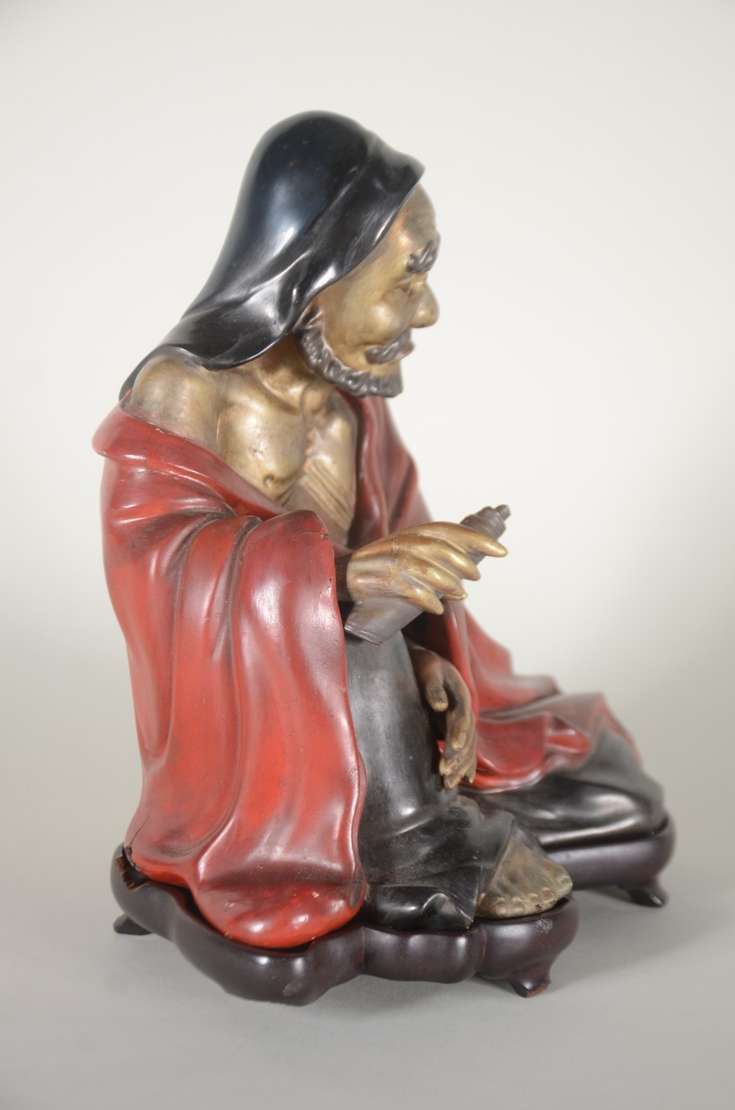 Estatueta de marfim representando Ancião com flores nas mãos, base de madeira.