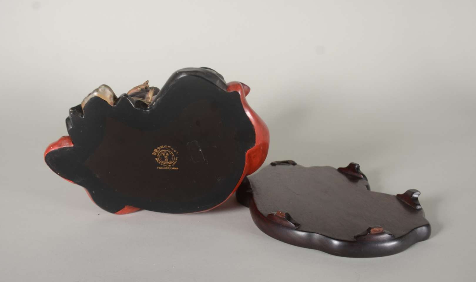 Par de figuras de madeira entalhada oriental representando crianças com touros.