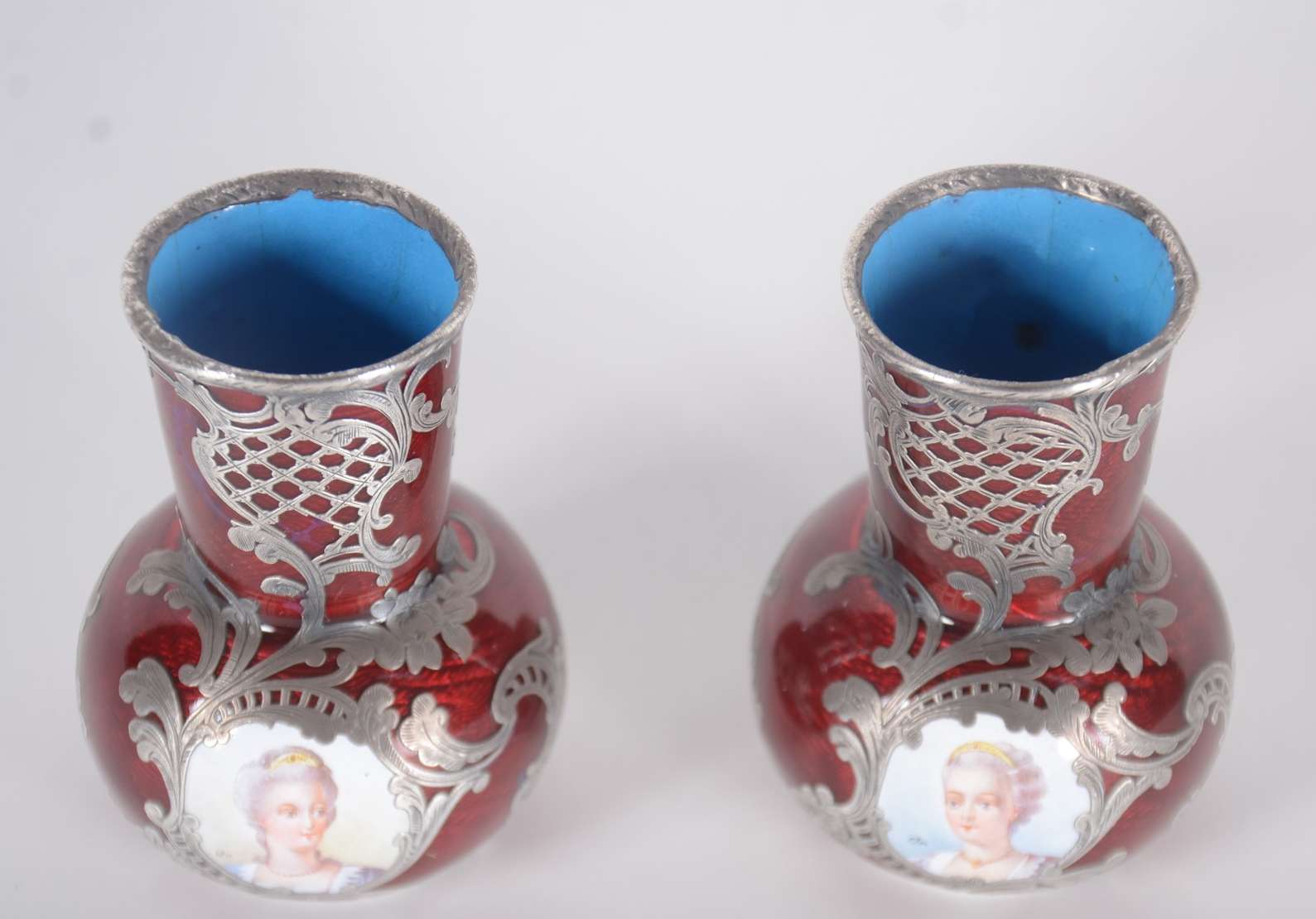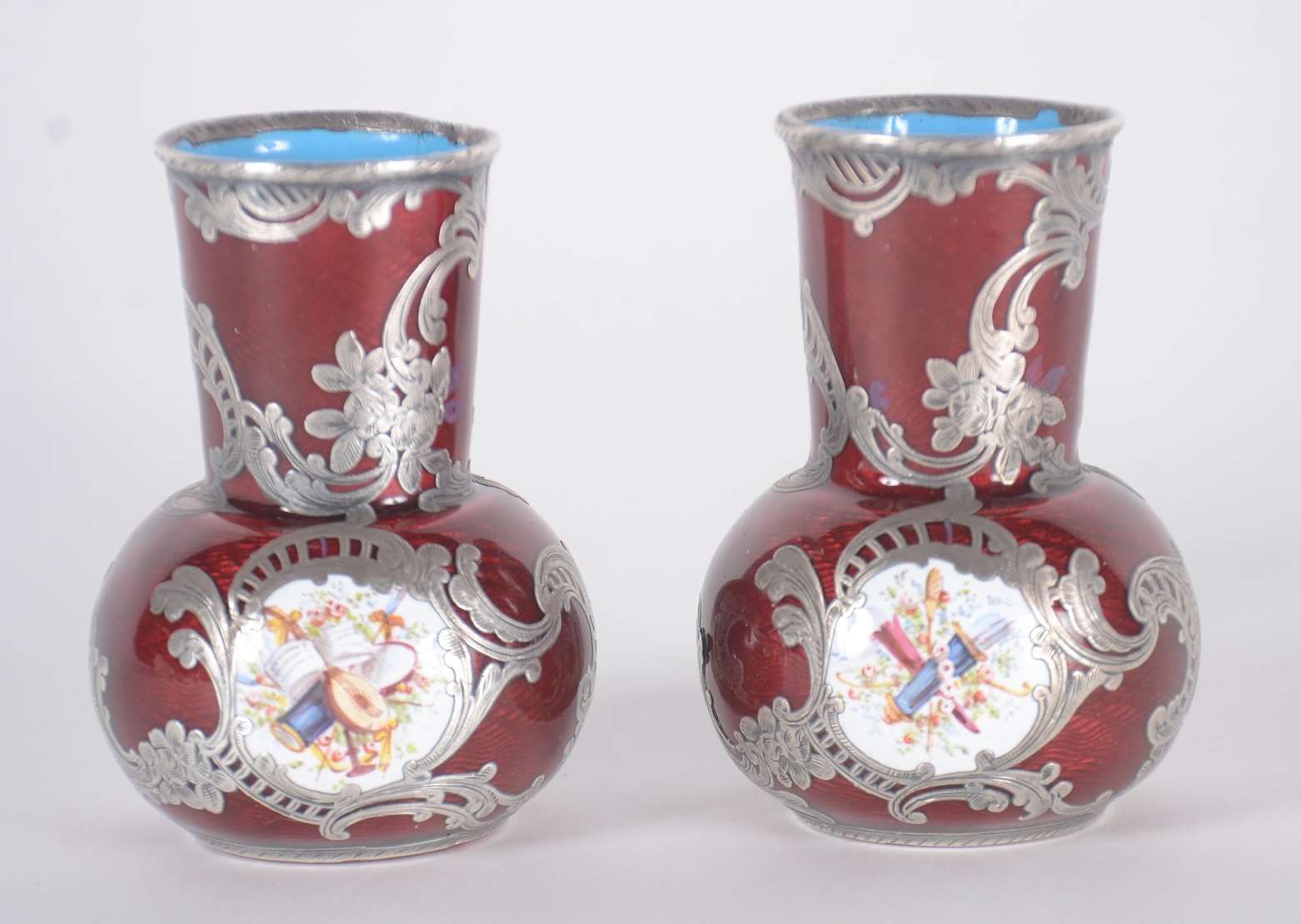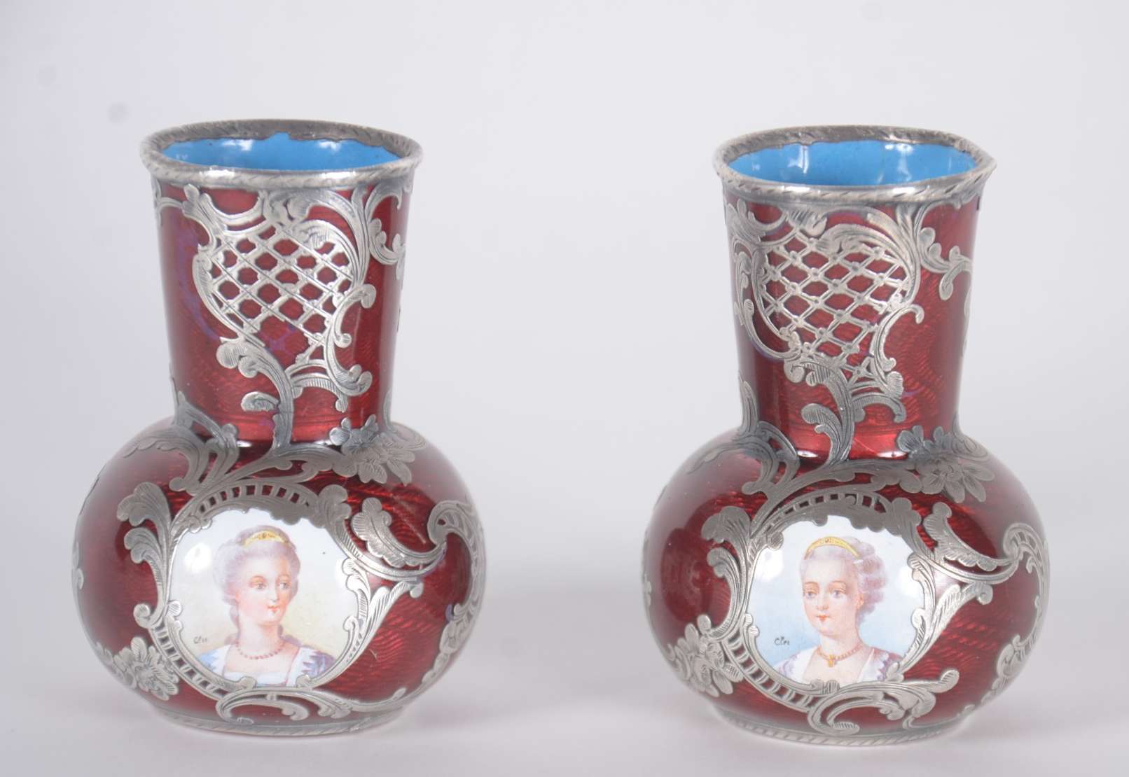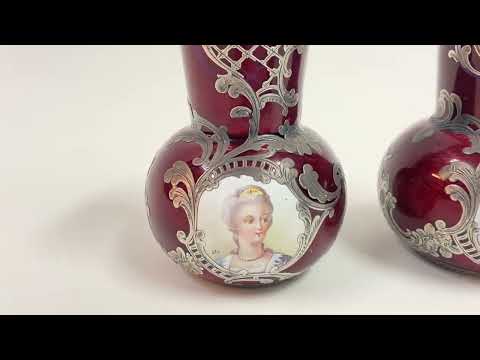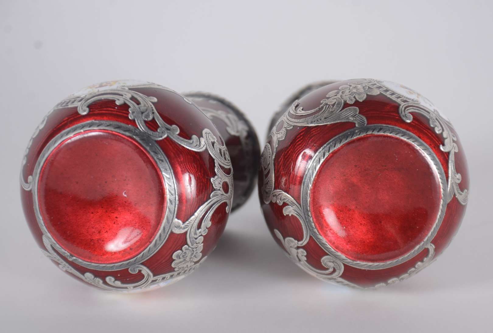 Par de ânforas de faiança japonesa de Satzuma, decorados de um lado com gueixas em policromia e do outro lado, flores...