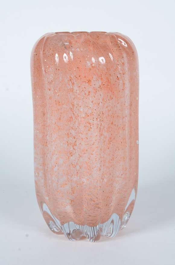 Vaso de vidro decorativo na cor rosa, trabalhado em gomos.