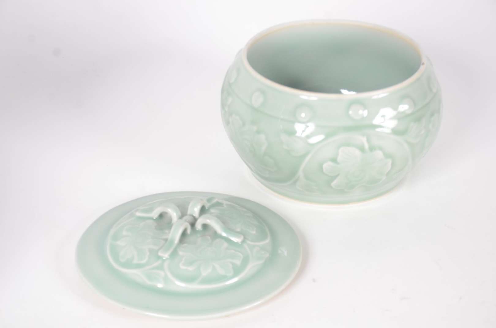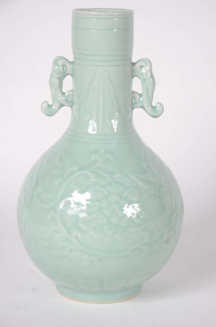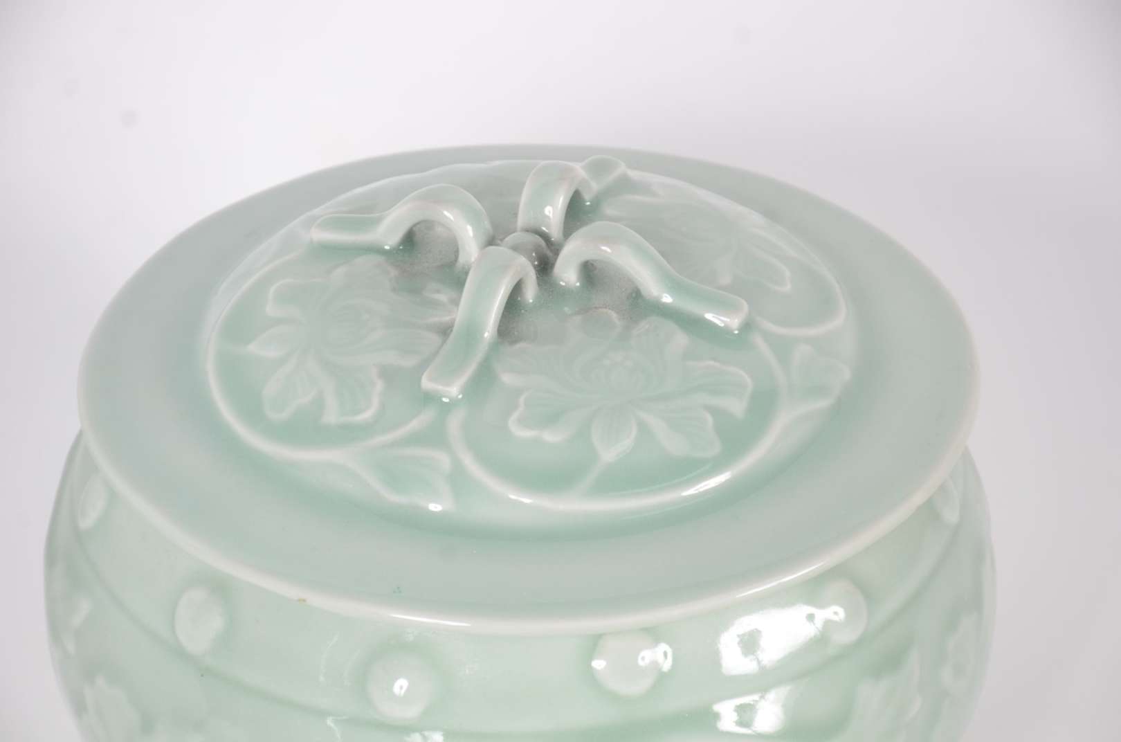 Oito peças diversas de porcelana chinesa na cor verde Celadon, sendo: par de vasos, potiche e 5 bolws. Pequenos bicados.