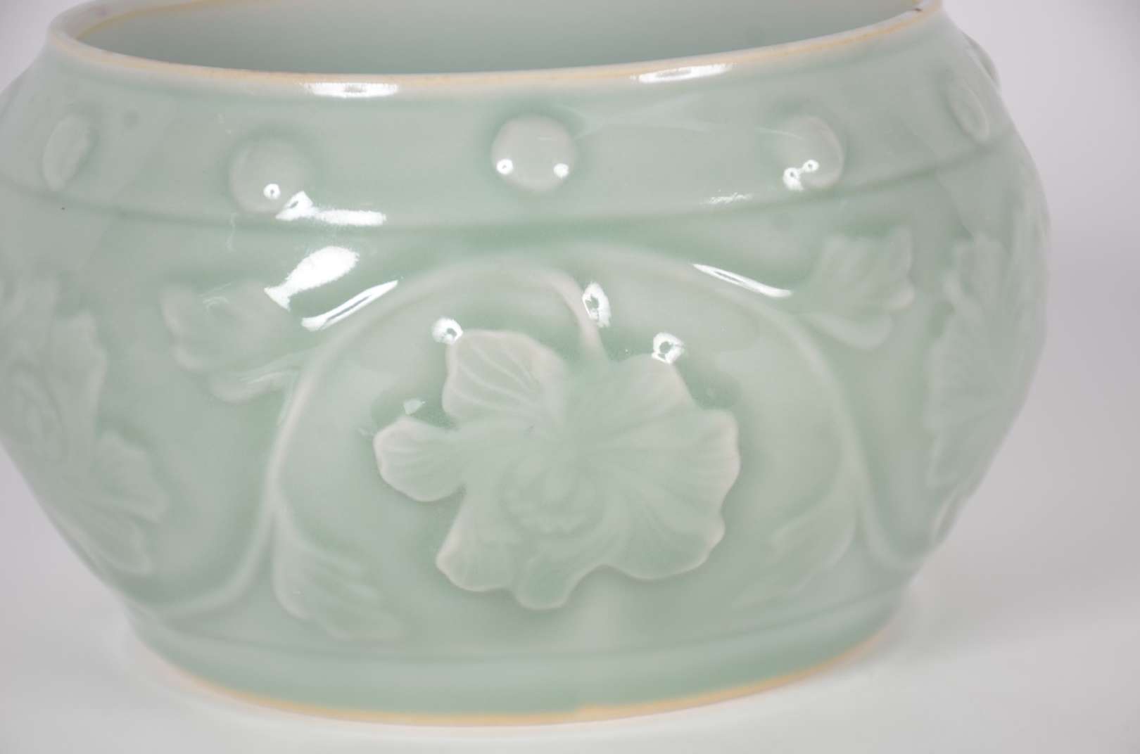 Vaso/floreira de pedra dura chinesa com trabalhos em relevo.